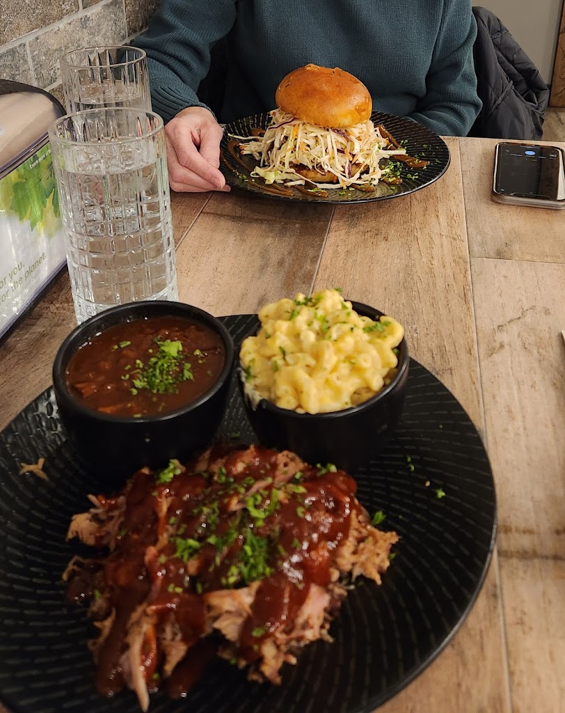 Not a restaurant I would choose on my own, but went with family and it was decent. The brisket was excellent, tender and well seasoned. The mac and cheese was enormous, honestly I think Id rather have had a side with it, and a bit less mac. Also, unfortunately it was a bit cold, and fairly bland. The burnt ends were awesome, saucy and flavorful, as were the beans. I think the street corn would be better if it had a bit of char, and/or more sweetness, but I really liked the sauce that was on it. Cute cafe style restaurant, so be prepared to place your order at the front.