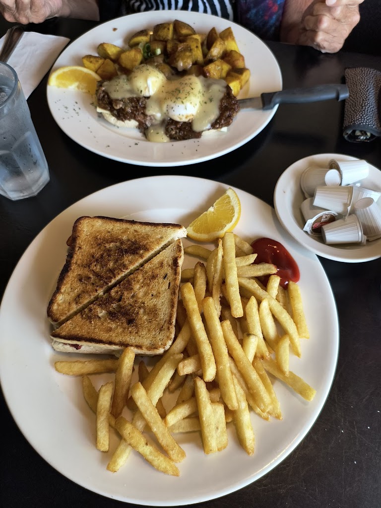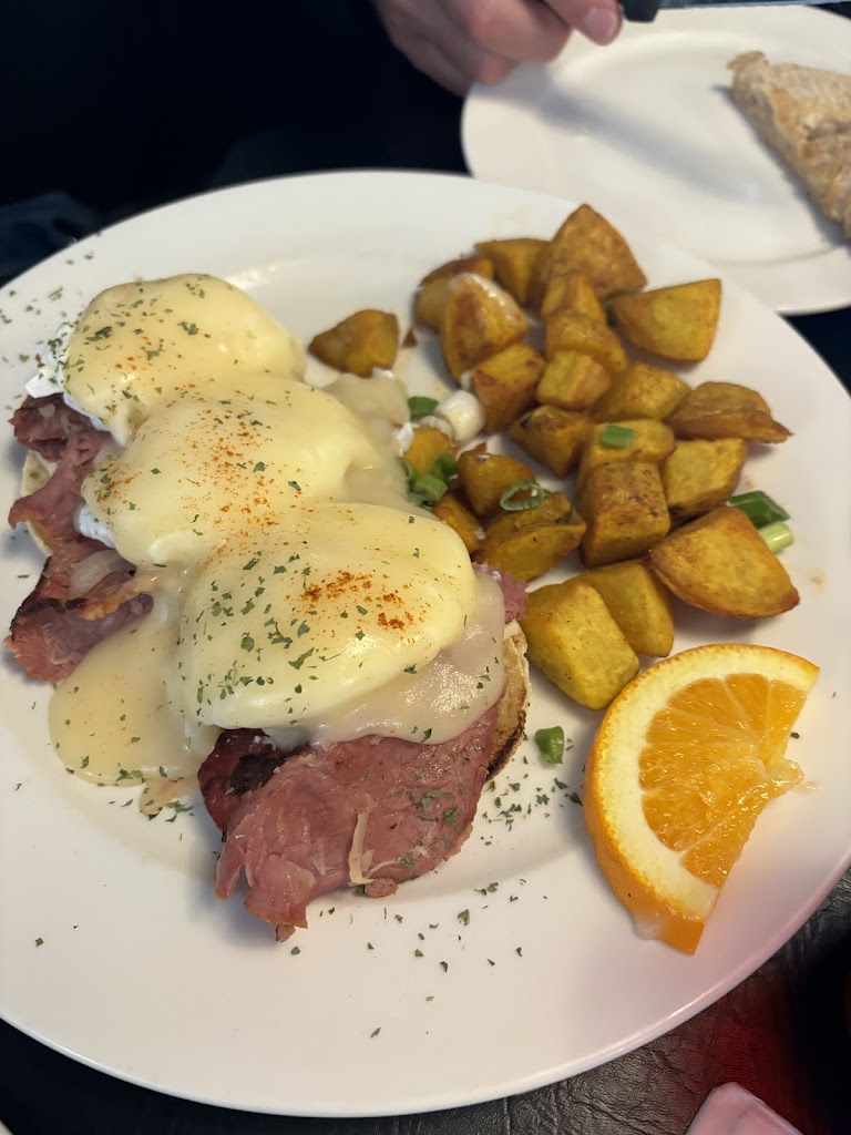 Amazing hidden gem for brunch, had the eggs Benny with pulled pork (asked for 2 eggs, it comes with 3), with crispy pan fried potatoes. The Reuben with saurakraut and cheese was so big. It came with tomato orzo soup, also excellent and I had fries on the side. Everything was hot, fresh and fast service, definitely coming back!