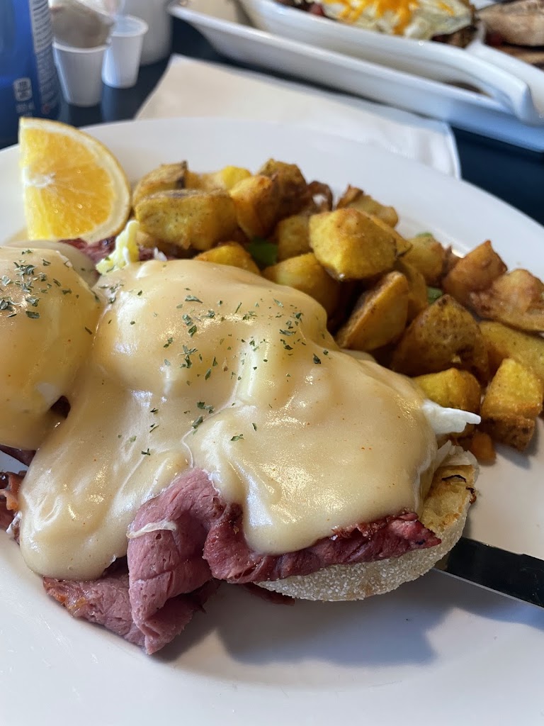 Great breakfast/brunch spot! My partner has been raving about it and took us there this weekend. Two of us had benny’s. I had the Reuben Benny, which was really good. Hollandaise was on point. Eggs were cooked perfectly. Hash browns were cooked really well, but a bit too salty. We got the cheese omelette off the kids’ menu, and it was a really sizeable portion for just $6. Will most to likely be back! The vent under our table was pumping the cool air something fierce, but otherwise the seating area was comfortable.