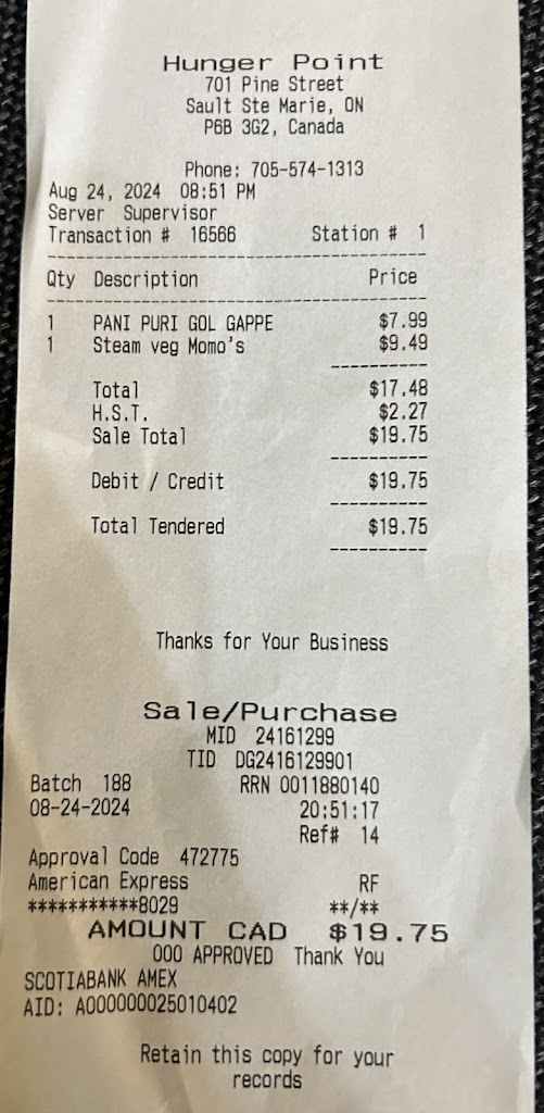 I am from Toronto, it was my first experience with hunger point. I am so fulfill with food and services. It was wonderful, i really appreciate their work and services in 7 years , first time in canada. I really got the delicious food that was I expected. Thanks to the team and prabh with all their services and politeness. I love hunger point. You must try indian style wings and fish pakora. It s delicious, loved it.