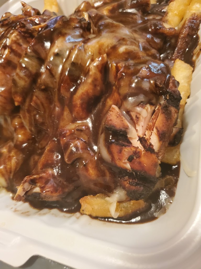I tried the popular jerk chicken (breast) poutine there is different options so that's why I specified just check the menu, I must say it lived up to expectations of flavor and enjoyment with crispy fries moist chicken breast that's right moist not dry with the mixture of the gravy on top and shredded cheese, hot sauce is nice to me but it's a creeper with the heat giving you a kick in the back of your tongue after tasting the flavor. The service was okay, staff could work on being more welcoming to people as they walk into the establishment to place a order. While waiting for my food to be ready a young lady walked in to get a refund for the food she ordered being polite and quiet about it so make sure to check your order before leaving.