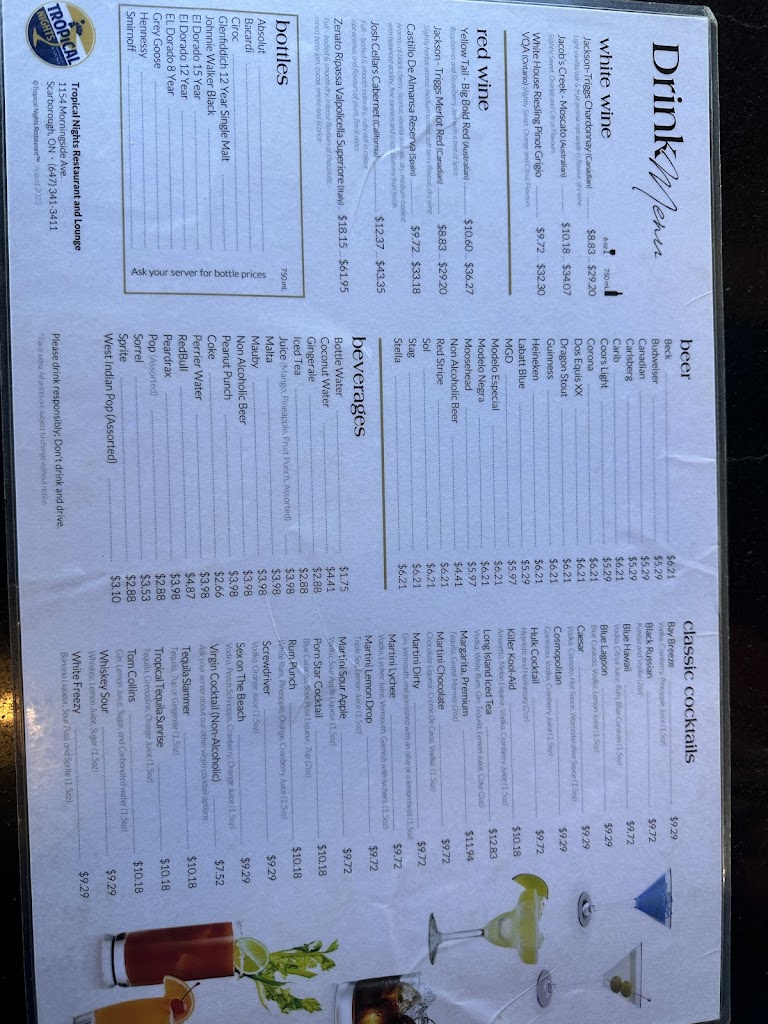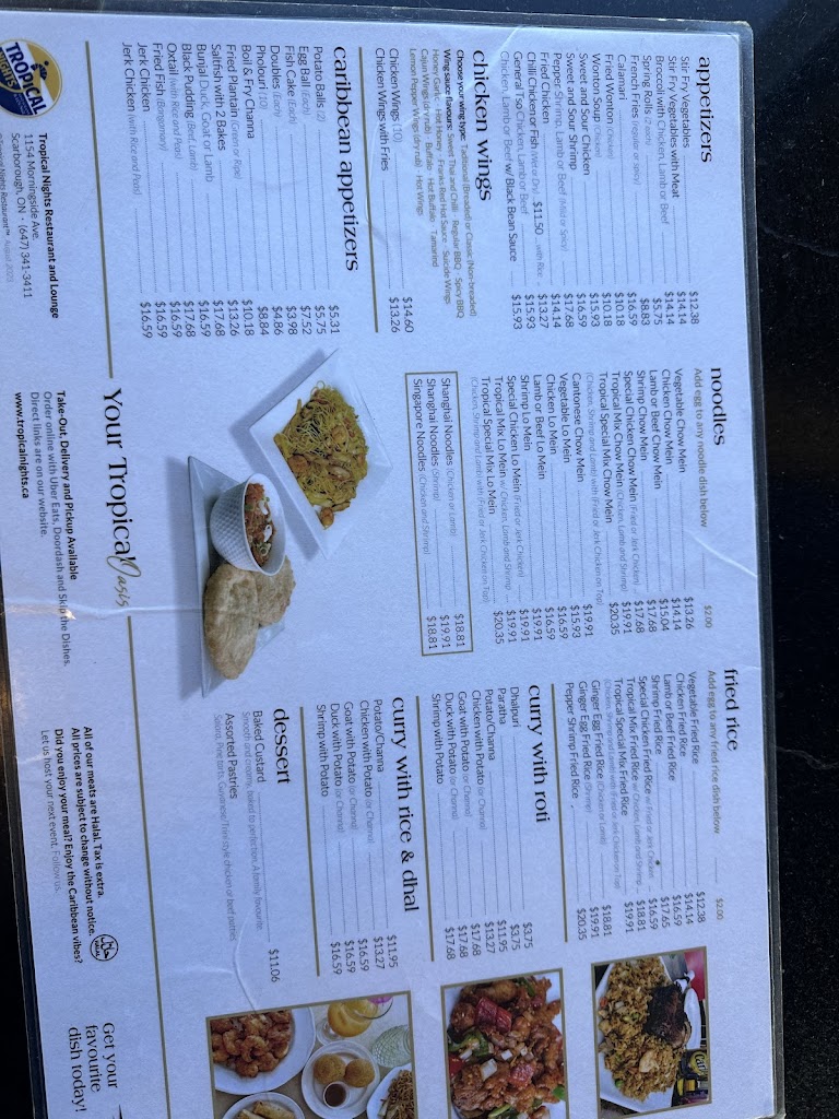 So I have been coming to Tropical Nights for years now for events on d patio and just getting together with friends...but I brought my mom to eat one day and we ordered the duck curry with dhal and rice and I have to say....wow...very tasty, not too much pepper and just the right amount of masala....really really delicious...my mom is very picky when it comes to curry but she totally enjoyed this and came back for seconds.. I can honestly say she will be back again...hats off to the chef..