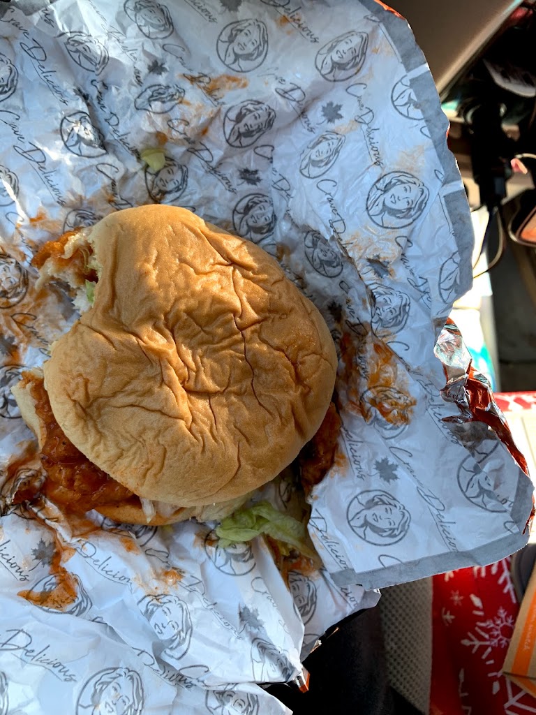 Big and crunchy chicken sandwich, I ordered on a Mary Monday. I like the way they marked the extra mayo on top of the sandwich to indicate which sandwich has the extra sauce. Waiting time for the order was a couple of minutes. Cleanliness of the dining and ordering order was noticeably tidy. I say on par with Popeyes, jollibees sandwich, quality wise and its good cost on a Monday. Would go again.