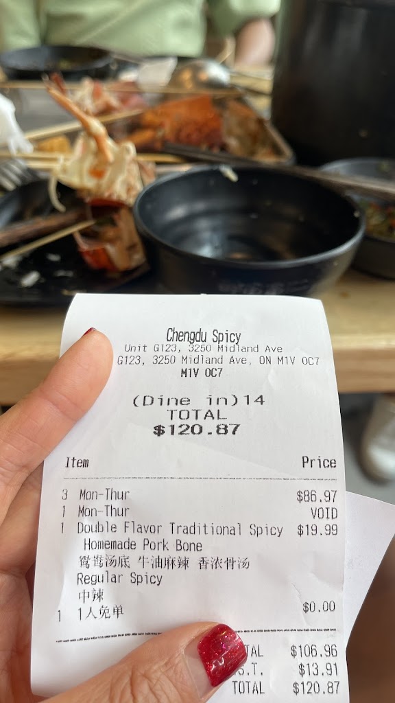 Chengdu Spicy Chinese Cuisine was okay. Given the area and the number of amazing restaurants in the vicinity, I probably would not come here again. I can see how some people would be big fans (if you like more specialty Chinese dishes like frog legs, chicken heart, gizzard, etc), but as someone who isnt too adventurous I dont think its necessary to come here. The primary reason we came was because they have all you can eat crab and lobster, which is pretty unheard of for other AYCE places. However, it was pretty difficult to get meat out of most of the pieces, although they did regularly refill the dishes despite each person basically loading up half their trays with seafood. One thing I did not like was their soup base. For $20 (split pot), this is more expensive than other, more luxurious hot pot places. And there was nothing special about the base taste. The meal itself was only $30 per person, which is a good AYCE price. However when paired with the soup base, and with tax and tip, we paid $105 for two people which is higher than other places. The section where you help yourself to the buffet ingredients is also very tight and poorly set up. You are basically back to back with other customers the whole time. It does become a bit of a pushing match depending who else is getting food at the same time as you. I will not be back but this restaurant is very busy so Im sure they wont miss my business. Come early (around 6) if you dont want to wait - although the wait did not seem long. 2 free pops if you pay with cash but that didnt seem like a good enough incentive for me to pay with cash.