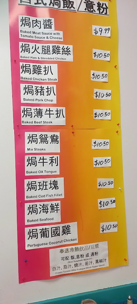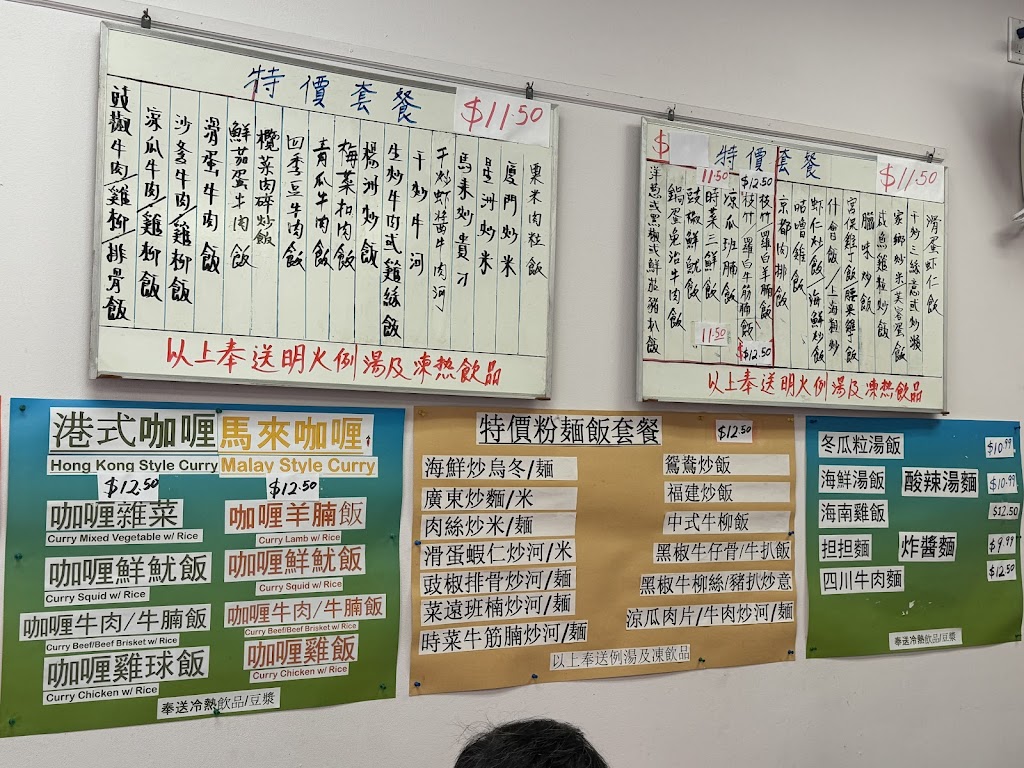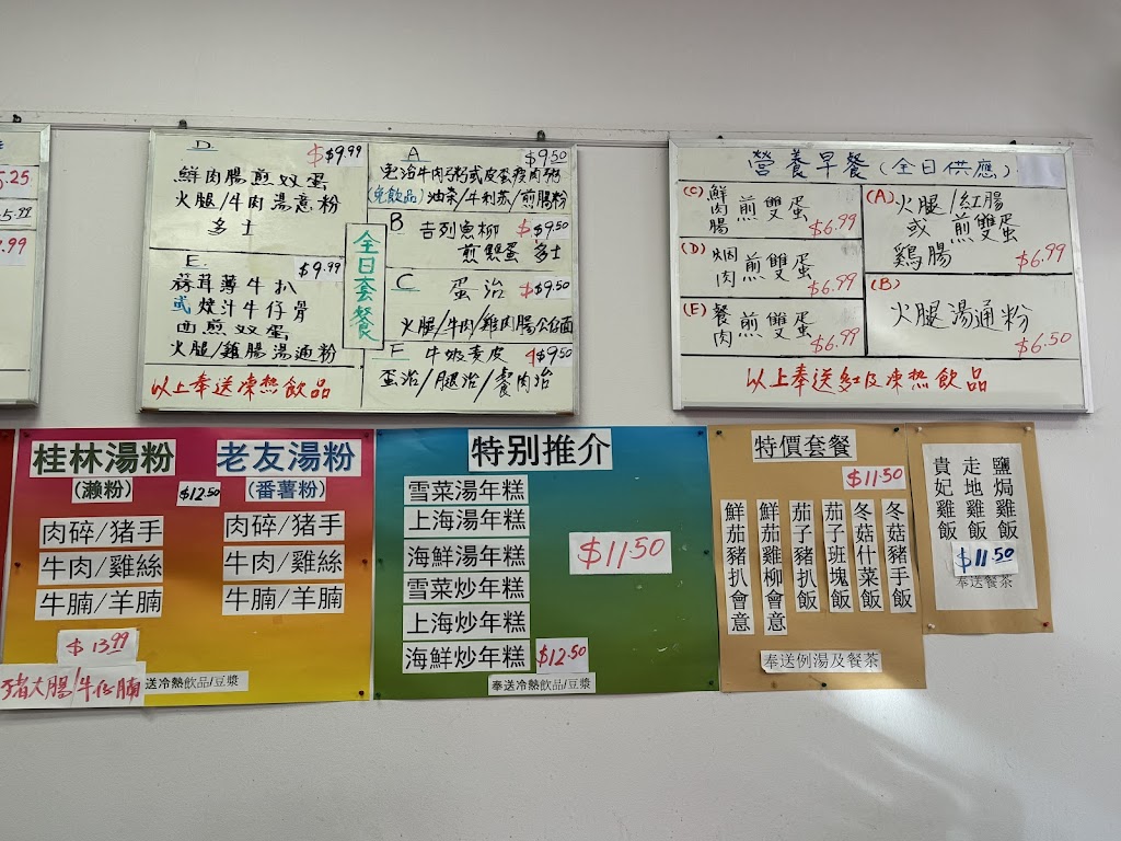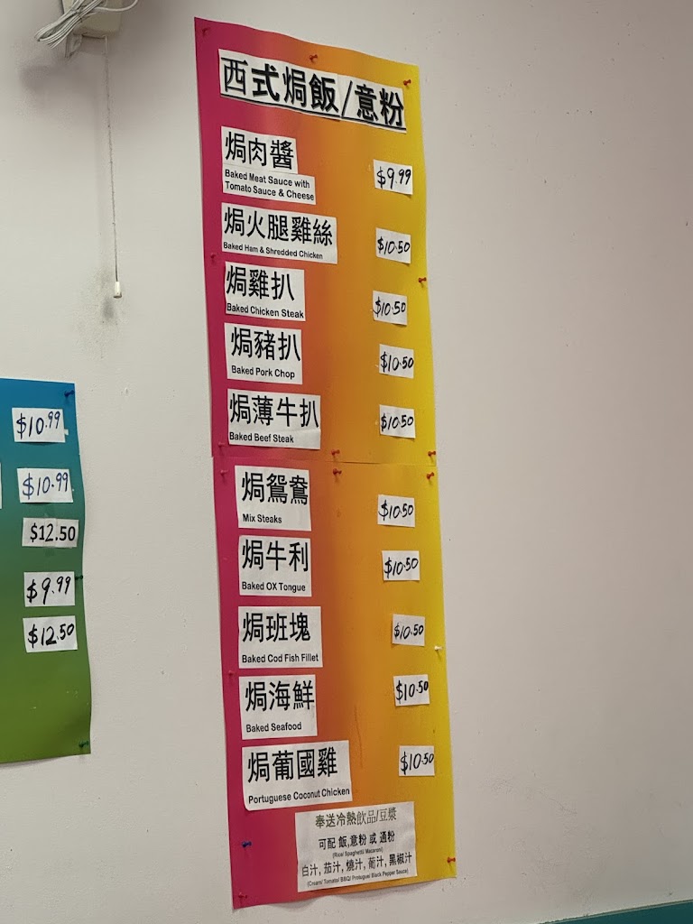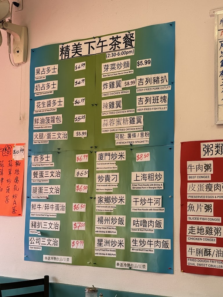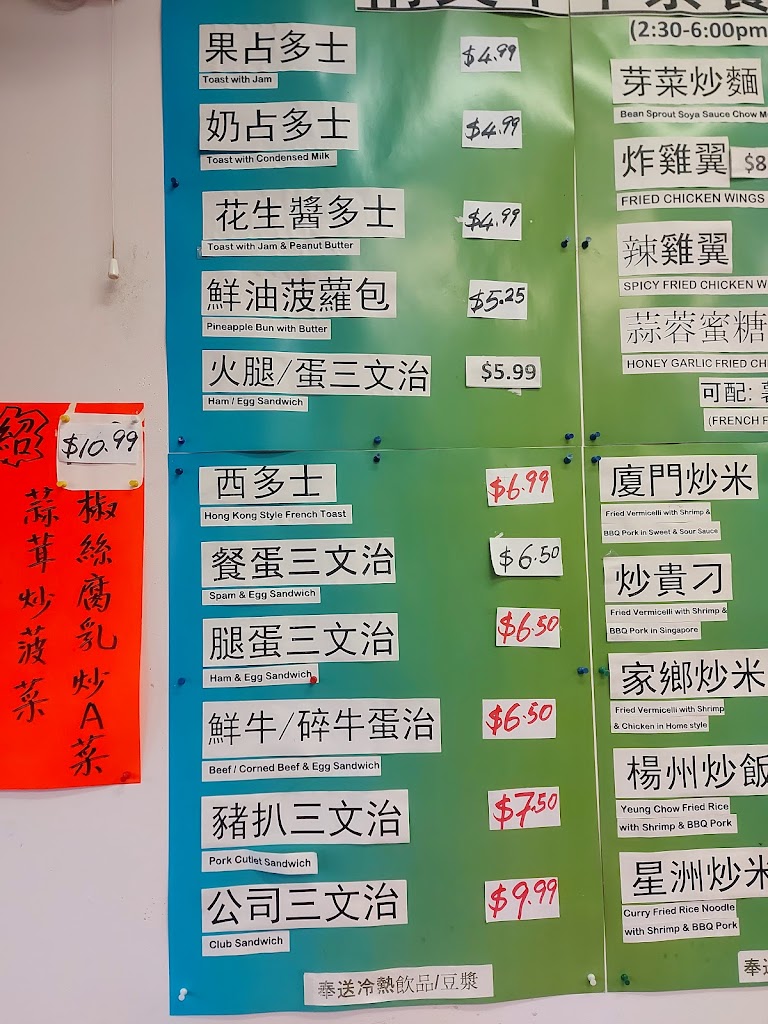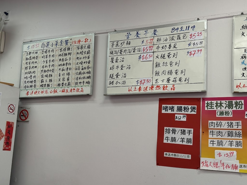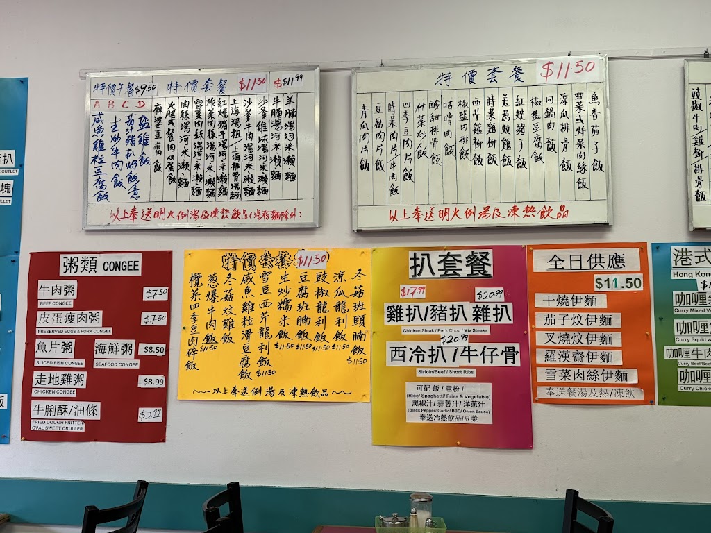 A no frill small restaurant serving breakfast, lunch, and dinner. There are many choices on their menu, including Hong Kong style breakfast and lunch. Besides single serving dinner plates, there are also set dinners. The tasty food is very reasonably priced.