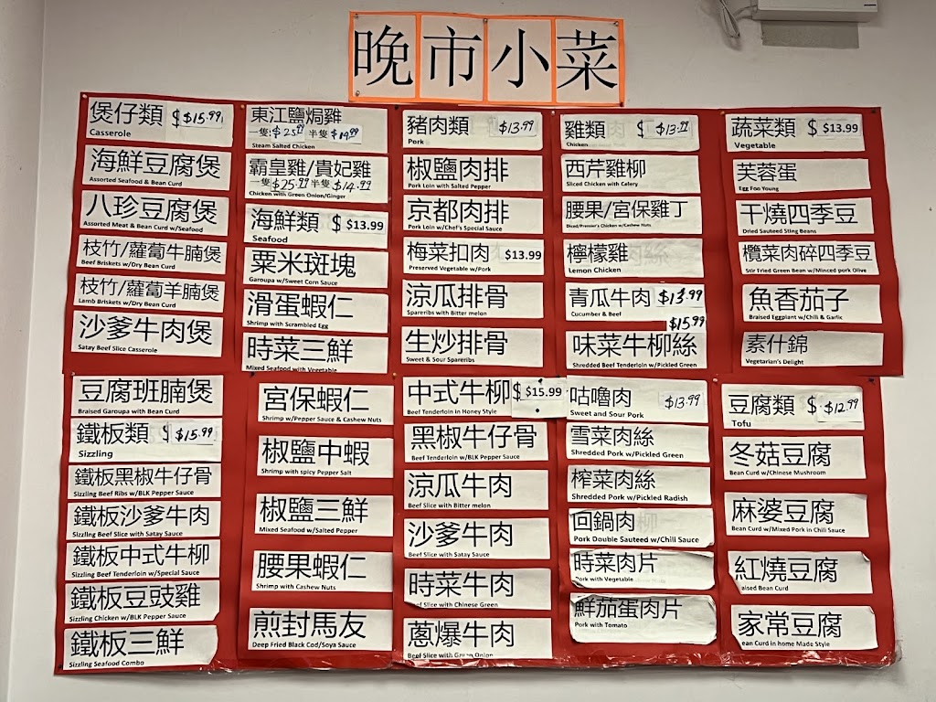 Great place with a huge selection of Chinese food! It s a no frills kind of place with handwritten menus posted all around the restaurant. They serve breakfast, lunch, afternoon tea, dinner etc! Their prices for afternoon are incredibly affordable and I like how their combos all include a drink!! Portion sizes are reasonable according to the price that you pay. Food is tasty. Staff are friendly. We got a beef sizzling plate and tofu hot pot and it was so authentic and tasty. The baked chicken rice w portugese sauce and sweet and sour chicken was just okay. Next time I ll come back and try their items for afternoon tea :)