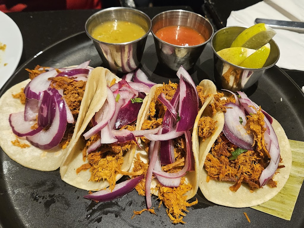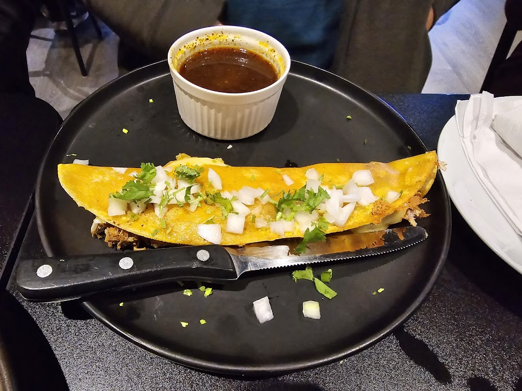 First walked in and the place looked beautiful, i really like the decor. And then a man greeted me (didnt get his name) but he was super nice. Asked him about the band setup and he said every Fri and Sat is a live performance (sometimes Sunday too, check their IG) and thursdays is kareoke. Didnt get to take a photo the food was so good. Ordered Burrito de Tinga and Quesadilla de Tinga and they were 10/10. The chicken was soft and tasty while the quesadilla was toasted nicely. Also asked for some hot sauce and we got I believe salsa verde (which was really good) and Im not sure the other, tasted like a slightly spicy salsa and that was good too. All together no complaints, def will come back.