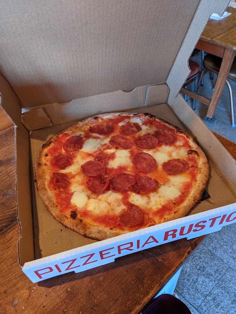 First time at Pizza Rustico. Oh my gosh so good. The wood oven pizza was absolutely delicious. We order the margarita and the divola. They staff were so friendly. I enjoyed chatting with the young woman who took my order and I walked to the back prep area and chatted with the guy making my pizza. Again so friendly. We spoke about Italy while the pizza dough was flying. Parking: Parking on street in front of shop