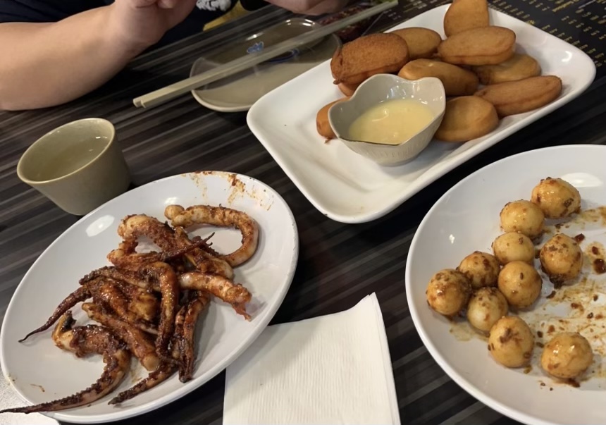 It was my husband’s birthday when we dined in here. He chose this restaurant because of the BBQ on it’s name. He loves BBQ so much and we really do. We passed by so many restaurants and ended up here. The “BBQ” word on its name, he assumed the restaurant specialty would be BBQ. And of course we are customers who want to try different places and keeping it as our to go to whenever we don’t want to cook. The place was not busy, only 2 tables with customers. I appreciate that each table have it’s own hand sanitizer. We tried quail eggs BBQ and squid tentacles BBQ, crispy bun, stir fried pork intestines, scallops with garlic and vermicelli, yang chow fried rice, kung pao chicken and sweet and sour pork. The 2 BBQ came first and I’m glad we tasted it first before ordering more BBQs. We were dissatisfied with the taste. We did not expect the fennel seeds which we’re not a fan of it despite it’s healthy benefits. They used same sauce for the BBQ so both had fennels. It was not mentioned on the menu if it’s spicy so, we expected it was not. But both were spicy and my kid can’t tolerate spicy much. It’s more like an Indian cuisine for the sauce used. Thanks that crispy bun came with condensed milk dip. It was really good! I love the stir fried pork intestine. It was delicious! The scallops as well! It was so garlicky and I liked it. It’s just salty. Which was perfect to mix for the bland yang chow rice. Kung pao chicken was good too! I loved it, lots of peanuts! Lastly, the sweet and sour pork made an impression! We were surprise how it was cooked, no tomato sauce at all. So, the color was different it’s all white no bell pepper too. Maybe this is the version of this place. Tasted more likely of lemon chicken. For the washroom, the door can’t be locked. So you need someone to watch for you. I hope they will fix the knob and change brighter bulb for light. Hand towel dispenser was not working too. Very important place of the restaurant is the washroom. I hope this won’t be taken for granted. If the room is dark you can’t see the dirt though.