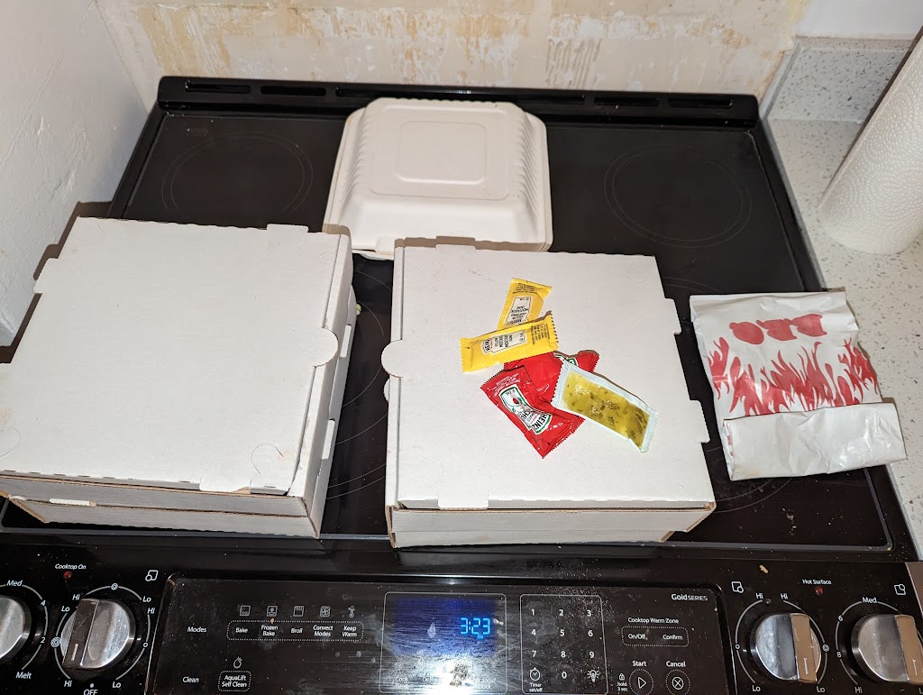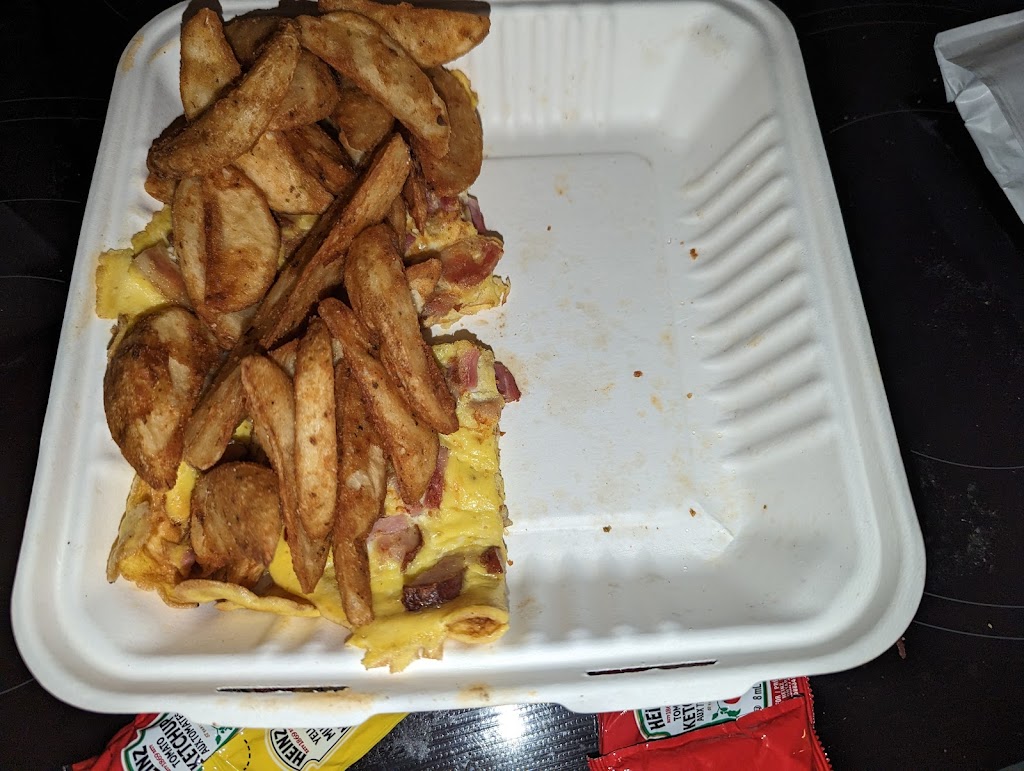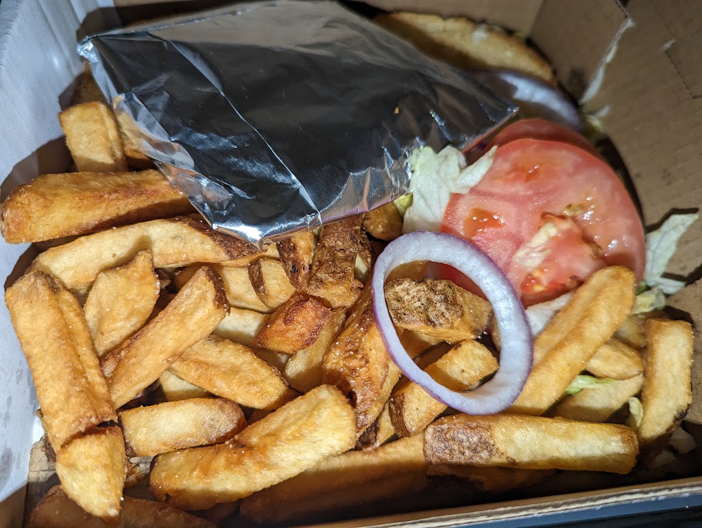 Wow, they are really leaning into the "Dive" theme now. In spite of the theme, the quality was passing, at least. Uber delivered it as a 2 for 1 deal. I didn't taste or notice anything off on everything except the buns and lettuce. The lettuce was either old, sat outside for a very long time, or was part of a rejected order. I'm leaning to the latter. Same went for the buns. It felt like they were starting to stale up, becoming dry and crumbling. I would go back, only to have drinks. Unopened drinks. The black containers are mine. Not sure why I started to prepare it all to be put away when I'm left with the fries and beef patties only.