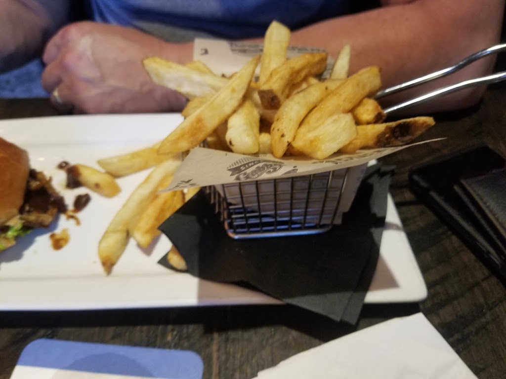 The waitress was nice. the atmosphere at the time I was there, was good relaxed not too crowded. the restaurant was warm and clean, inviting. the fish batter itself was rubbery. But a very good size portion. I requested mine to be well done and it was not crispy ... Came with a very nice size portion of coleslaw and fries. the buffalo chicken loaded potatoes were really good! but the portions of the potato itself was small I found. Overall very enjoyable and great comfortable seating. The large windows and big screen TVs gives you lots of scenery and things to watch while youre waiting for and enjoying your food.