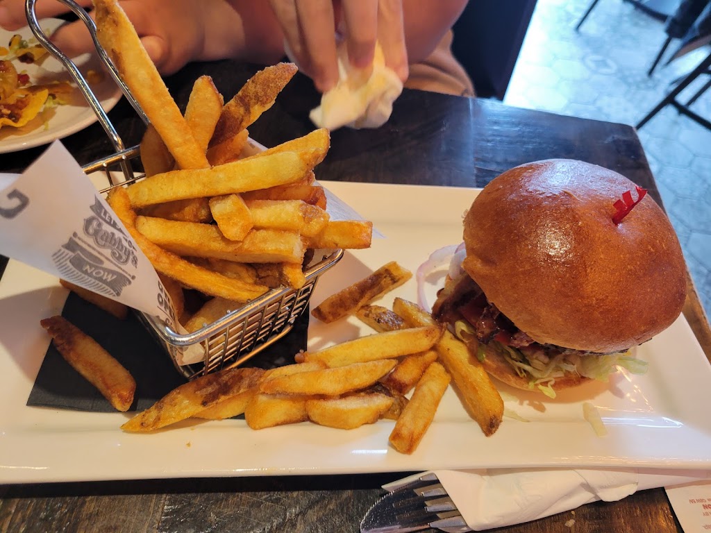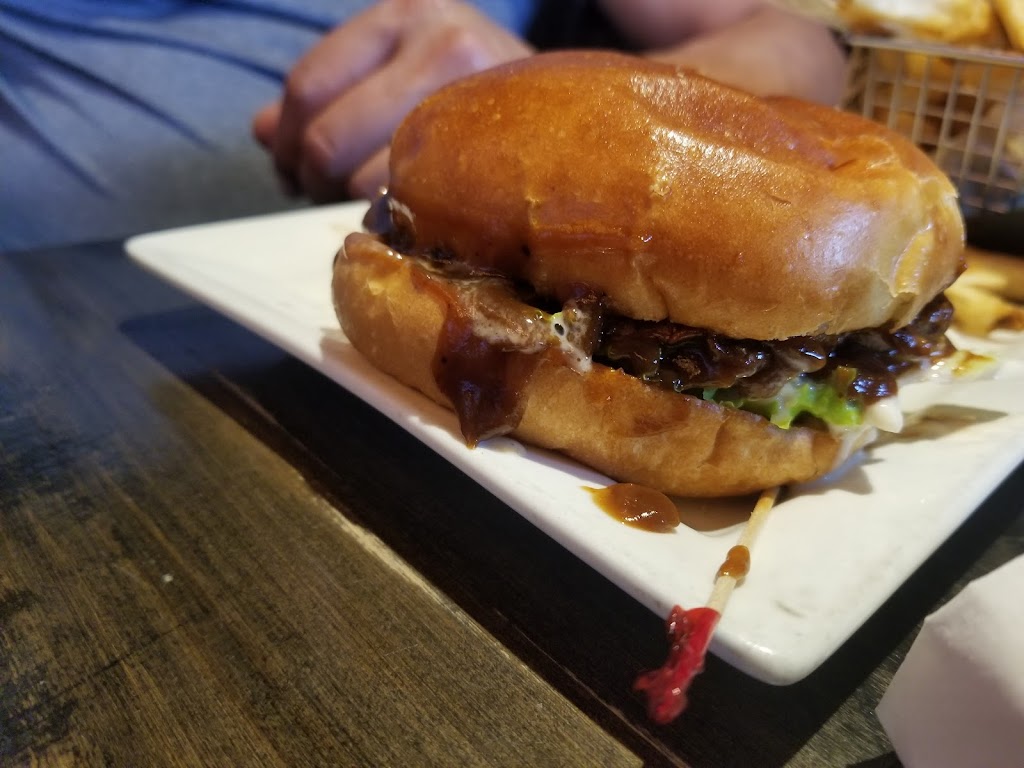 Food is great but i prefer takeout. the atmosphere and decor does seem nice there but i prefer going during the night when the lights are on but it gets a bit busy then though. Dined in a while ago and i enjoyed it and would recommend. I got the a specific burger which i know isnt on the menu anymore but it was good. Also had it for takeout and it was packed very nicely. The meat was in a separate insulating wrap to keep it hot and juicy and the buns with the toppings were kept separately to keep them from getting soggy and they include a lot of fries which id like it be crispier but its okay. Iman is a great waiter and had excellent service