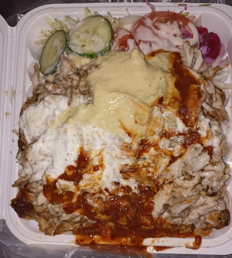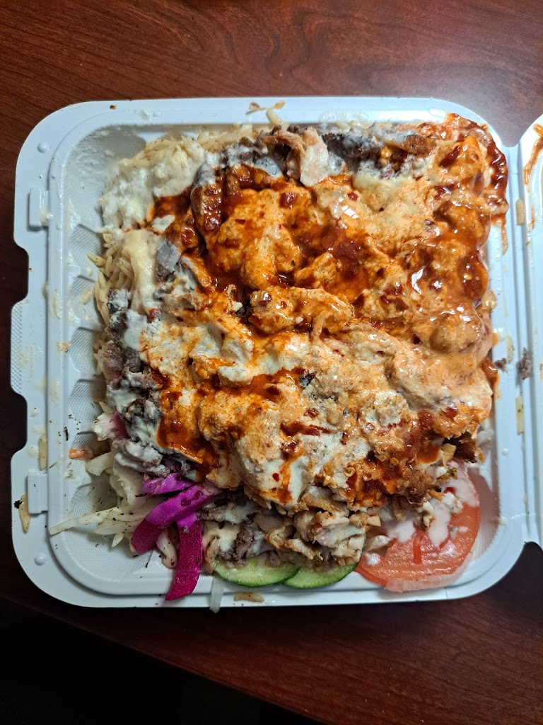 Ordered this on Doordash. Big portion, taste is just okay. I prefer a more garlicky garlic sauce. The beef was a little dry. Potatoes wedges were good though. Overall is quite average