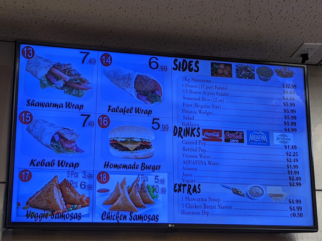 Simple shawarma, nothing special. I ordered a shawarma wrap and felt the meat portions were small. The good thing about this place was the price. We got 2 wraps for $15 total Wouldn't recommend or come back as there are a lot more other options around the area.