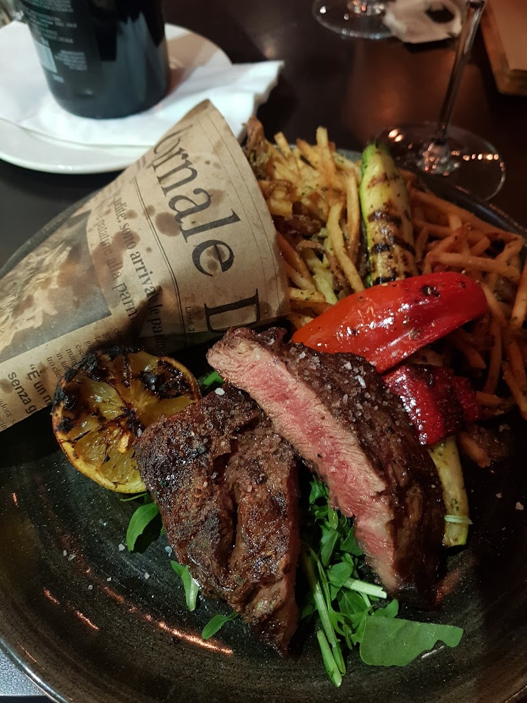 Not the first time at this restaurant, but probably the last. Service was mediocre. We asked to substitute Parmesan fries instead of pasta (and was told they dont do substitution)which we have done in the past. Food -was not hot, grilled vegetables were still raw and cold. The pasta was lukewarm and bland . The waitress didnt even come back to the table for twenty minutes. At that point why bother saying anything. The best part of the meal was the pizza. At least they got that right.