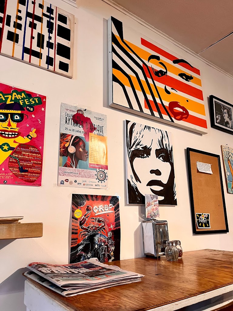 Unlike many restaurants in Quebec, the look is completely distinctive. You feel like youre traveling into someones world through the paintings, the music, the comics, the style, the organ at the entrance. Everything with the service really brings us back to a feeling of home or a friends house. The food and drinks are really good and very affordable (even disruptive compared to other restaurants)