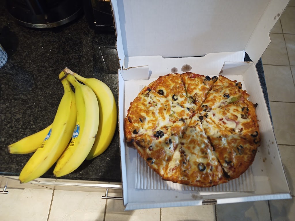 $23 and some change for a "medium" 10 inch pizza. When we got them we had to ask to make sure it was a medium. These pizzas are absolutely tiny especially for the exorbitant pricing on them. I wasn't even paying for these out of pocket, a company I work for was and I was still frustrated about the quantity. As for the quality I was hoping for some gold flakes on a pizza this small, costing this much but it was exactly the same as any other fast food type pizza place. Good help also must be difficult to find beacuse they can't cut equal slices it seems. Banana for scale