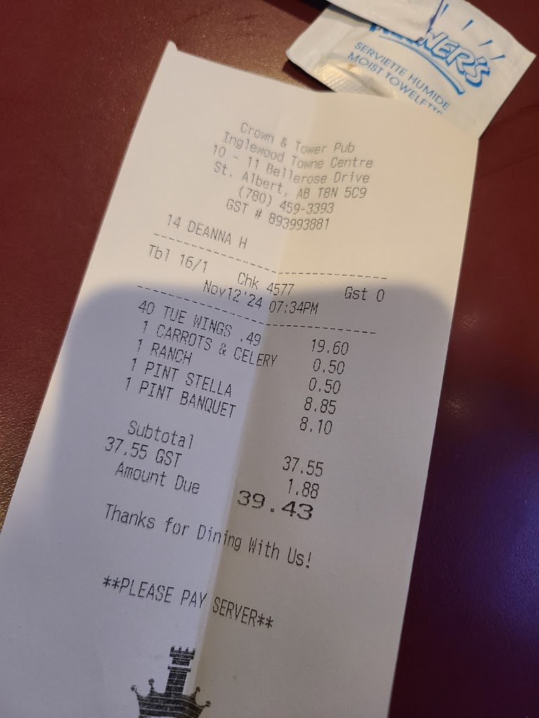Was looking for a new venue to enjoy some wings and beer. Well I must say I ve found my new special place right here is St.Albert. The wings were delicious and the Bartender was very polite and extremely busy. We sat at the bar which turned out to be a bonus. As we enjoyed our beers and delicious un-breaded wings, we observed how efficient and smooth the staff interacted with each other.The place was packed as it was game night, but the staff worked like clock work. The bartender was amazing to watch, multi tasking tapping 2 beers at once very effective. We will certainly be back in the near future, did I say how delicious those wings were. And the high point the price is very reasonable, which warrants my return visits. Well done Crown & Tower...