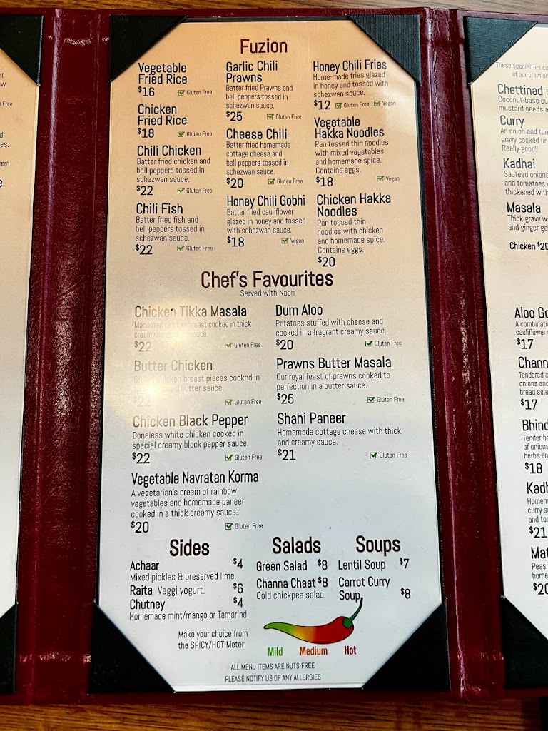 Great food , chilli fish, butter chicken, veggie pakora, all paneer, daal and aloo gobhi are some of our favorites. Spicy but not too hot . !!!
