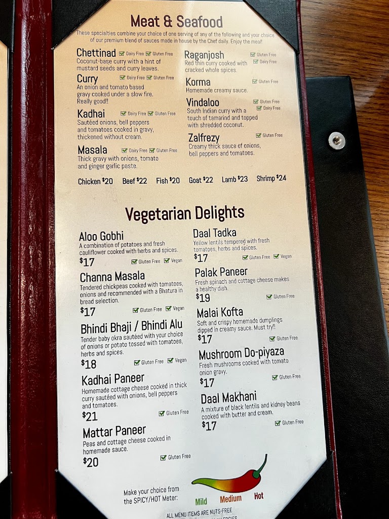 Delicious Indian food. You can cater the amount of heat they add, which is so nice. The menu is extensive and they do great deals for lunch. Also the wine is priced very good, and large pours. Will return again soon. Thank you! Vegetarian options: Plenty of veggie options Dietary restrictions: Plenty of GF options.