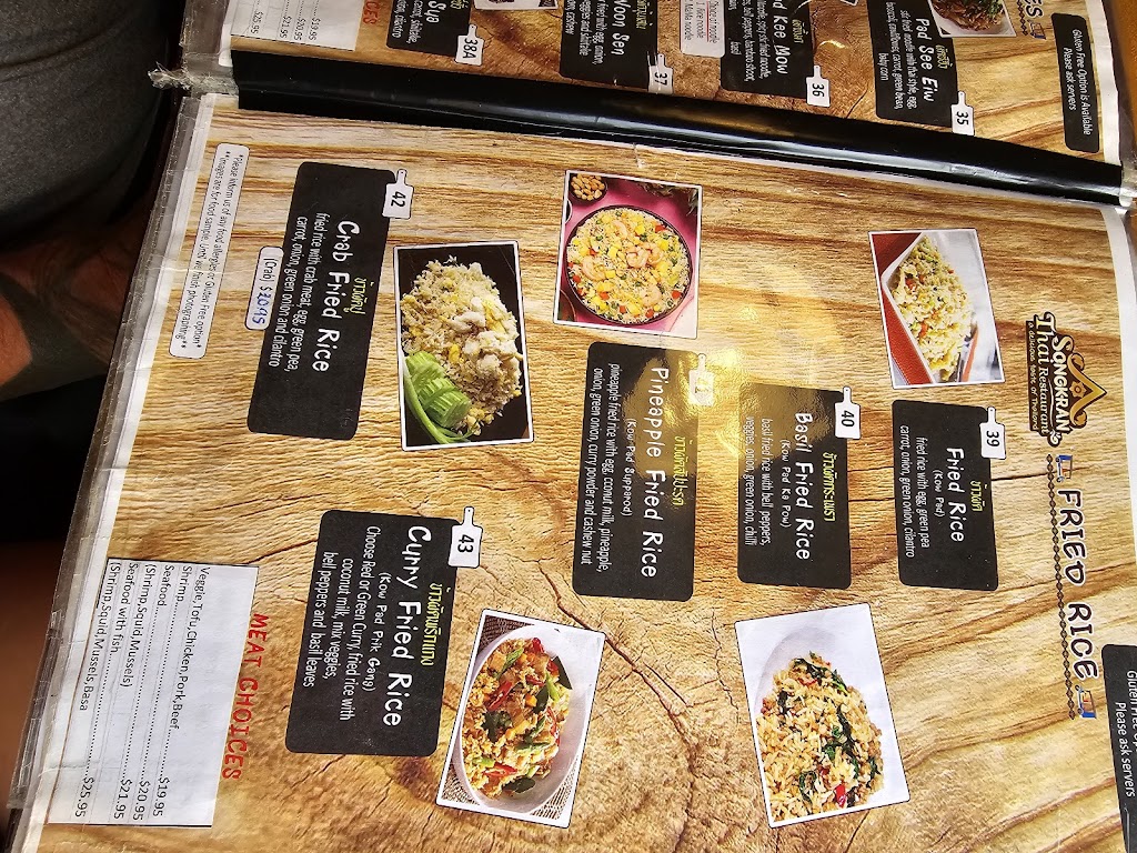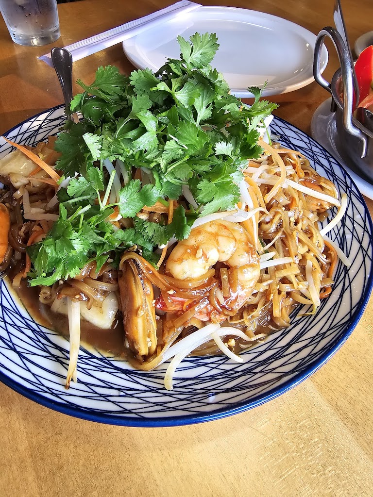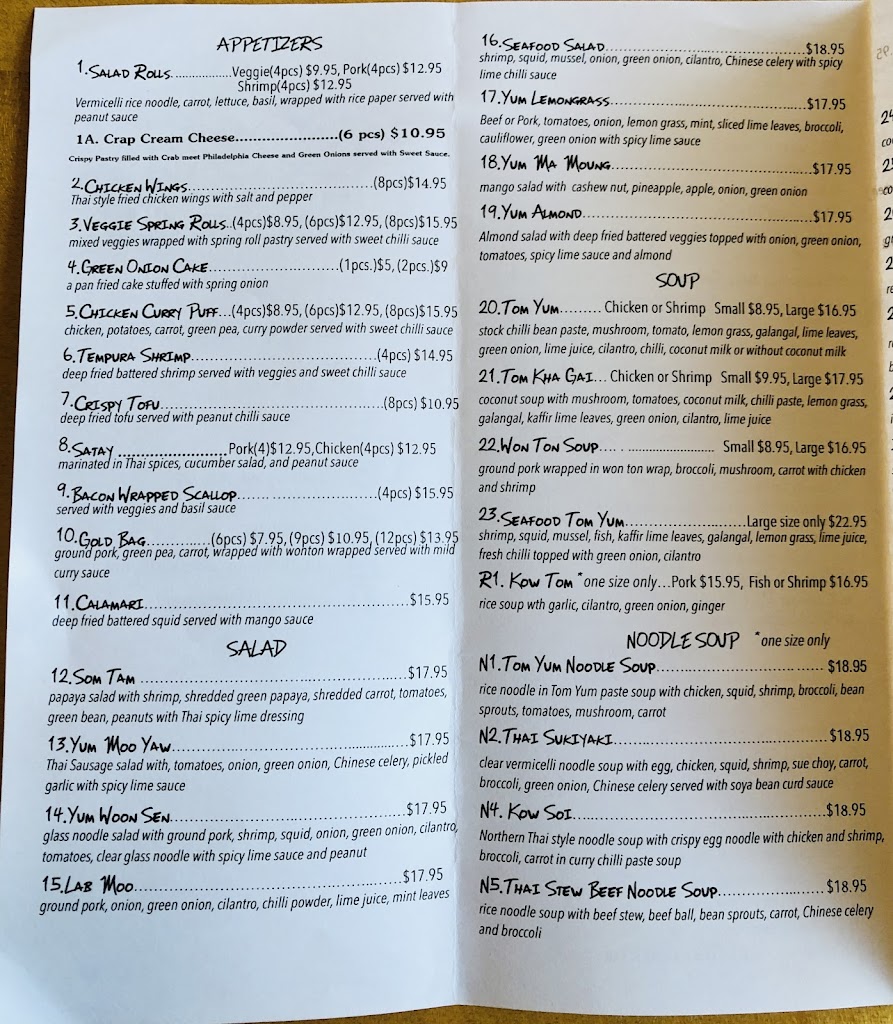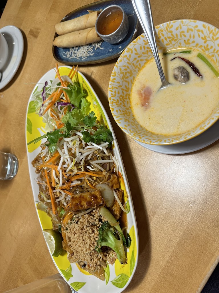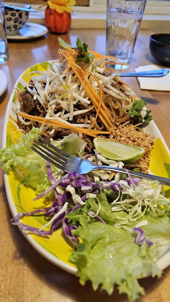 Hidden gem. They had so many options, it was hard to chose. The categories on the menu were arranged nicely in appetizers, soups, salads, noodle and rice dishes. The price with meat/seafood was at the bottom. The atmosphere was nicely decorated with a cozy vibe, little outdated but still nice. The service was okay, not the greatest English speakers, but worth the visit because the authenticity of the food. They had cute Thai aluminum dishes. We ordered the salad rolls to start, the peanut dipping sauce was amazing. As well as the pad Thai with seafood and chicken curry vegetables with a side of coconut rice. They were reasonable portions and flavors were amazing. We had leftovers to bring home.