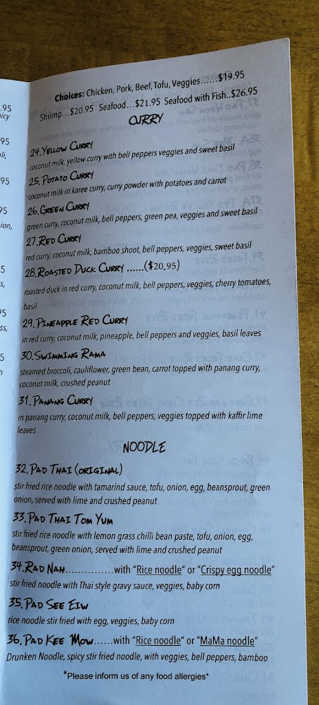 April 18, 2024 Ordered 3 dishes: pad Thai, Tom Yum and a beef stir fry. All the dishes are delicious Fast service and good customer service. October 8, 2023 Ordered Shrimp Tom Yum soup, Roasted duck curry, Seafood Pad Thai, Basil fried rice with shrimp, Pad Pong Ka Ree with beef, and Calamari. Every dish was delicious Service was fast and good. August 30, 2022 Dinner time Ordered large Tom Yum with shrimps, Roasted Duck curry, original Pad thai with beef, Basil stir fry with seafood, and Coconut rice. Wow, amazing, delicious food, every dish we ordered were outstanding Glad to find another great Thai restaurant