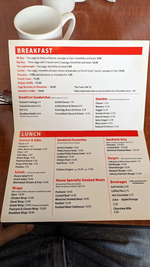 Had corned beef sandwich with fries. Excellent. Wait staff extremely friendly, not trying to rush you. Great spot for breakfast or lunch, reasonable price. Highly reccomend.