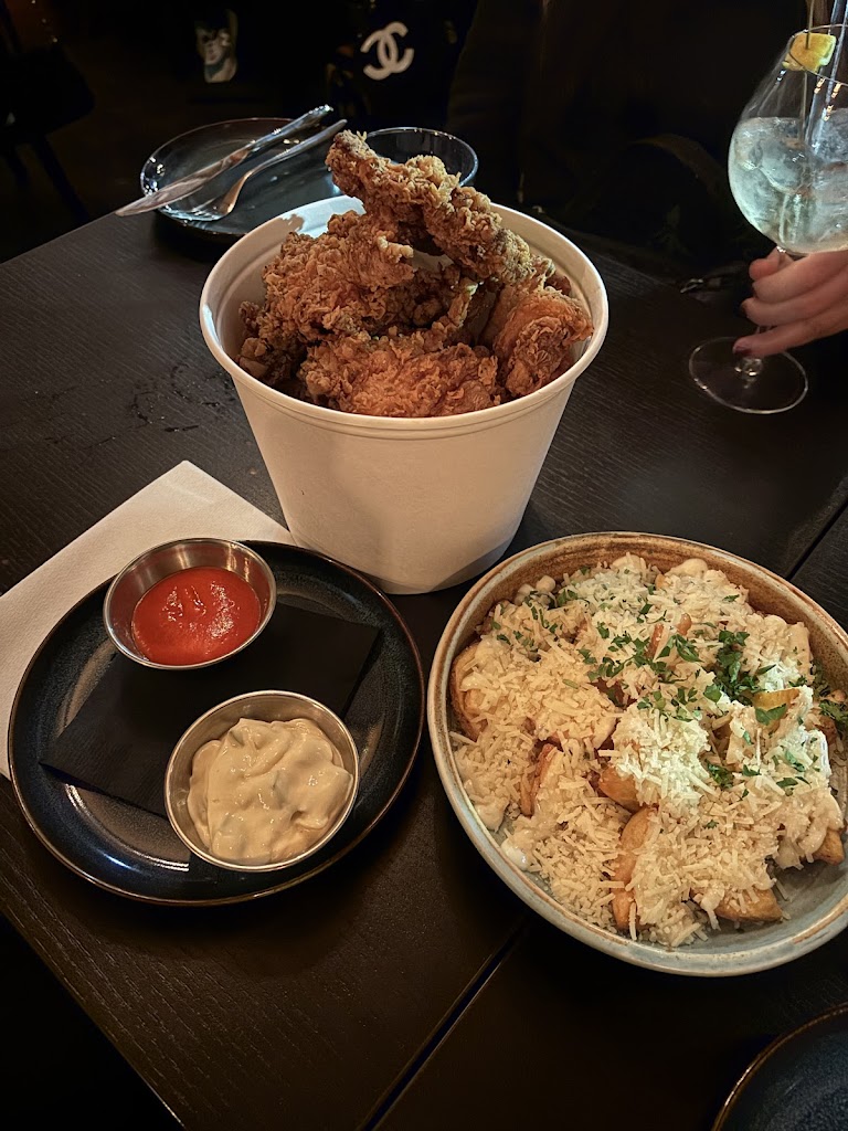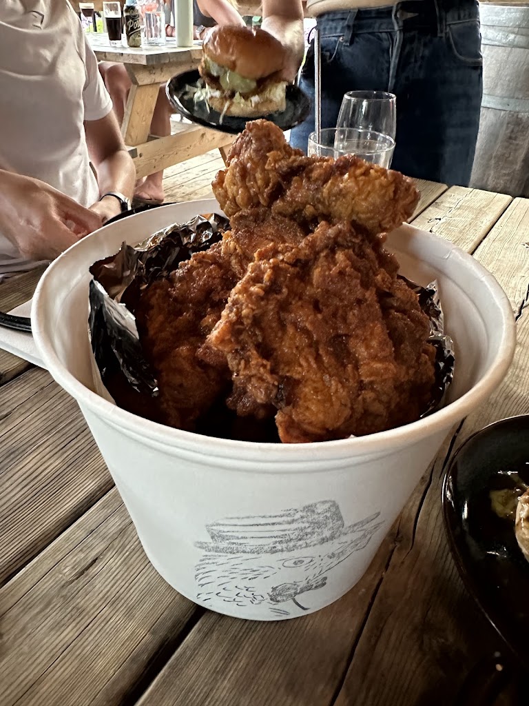 The bucket of chicken was excellent, no bones or gristle, crunchy, nicely spiced. The side sauces were good. Loved the deep fried olives (although expectedly a bit salty). The Brussel sprout side dish was disappointing with only about 4 sprouts and very over cooked, although the blue cheese and squash topings were very good. The thin potato wedges exceeded expectations and very delicious. No problems ordering or picking up. The lady was courteous.