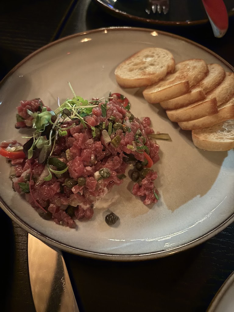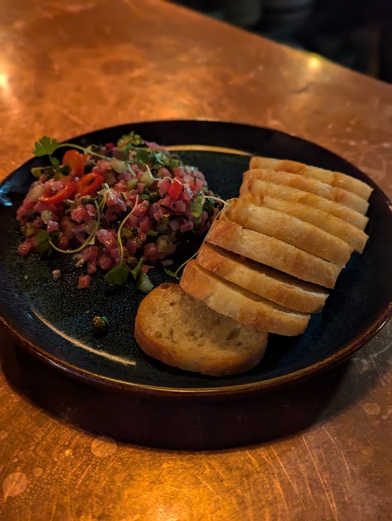 Delicious Food, and Great Vibes. Truly a good find. Went here for our anniversary, and it is the perfect balance of upscale, finer dining, with a cozy, friendly feel. The steak tartare was delicious and definitely worth the try if you ve never had it. Truffles fries had a massive portion, with massive flavour too. These were absolutely delicious. The chicken sandwiches are next level. Stacked high, and loaded with delicious sauces and cheeses. Overall I d give this place a solid 9.5/10, a must try if you re in the area. The only downside is how small it is, but in the same way it adds to the vibe of the whole place .
