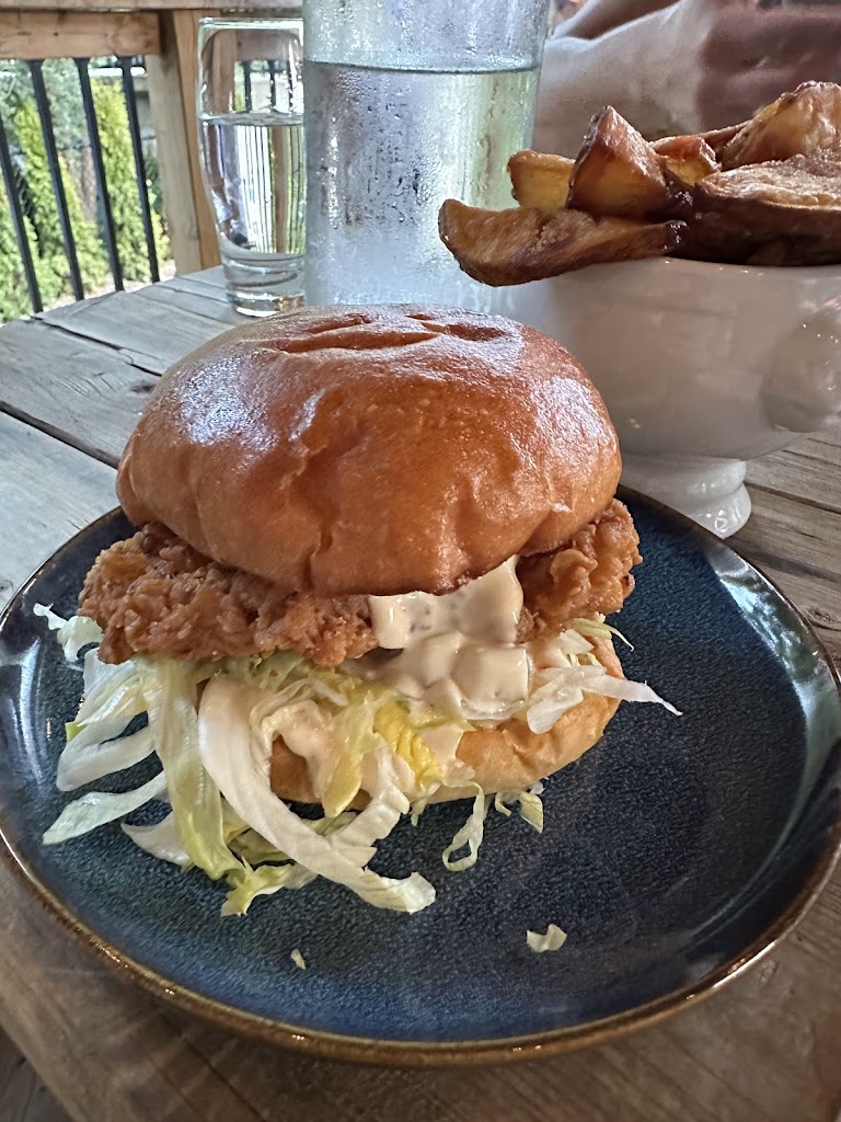 Cute and cozy vibe, very friendly service. The Caesar salad with fried pork belly was great, AMAZING fried chicken sandwiches, with perfect light crispy breading! I got the Honey Mustard one and WOW- just perfect! We also very much enjoyed the thin potato wedges surely will be returning any time we have a craving for a chicken sandwich, I assume their burgers would be great too!