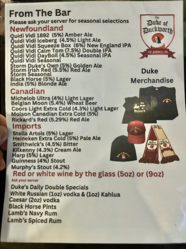 Stowed away at the juxtapose of Duckworth Street and McMurdos Lane, The Duke of Duckworth is a famous haunt, and I knew not how famous until I read rave reviews about its fish and chips and its exclusive use in the local show, Republic of Doyle. Fame apart, the Fish and Chips lived up to its hype, the fish almost melting in your mouth. We also tried honey garlic wings, which was done pretty well too. Didnt get to try the booze, will update once we go back! Prices are on the higher side though, buoyed by the hype, I believe? The atmosphere is quaint and refined, like polished old wood. Retro music plays in phases and completes the vibe. Theres a few slot machines and a billiard board around. When we went at afternoon, the place wasnt crowded at all. They always have some specials on offer, up on display right where you enter from. Service is prompt and good, albeit due to the low occupancy, I believe. The waiter made us a fair recommendation about what to try at the Dukes, since we went there for the first time. Will go again! Wheelchair accessibility: Not accessible using a wheelchair, considering the entrance is on a flight of stairs without a slope.