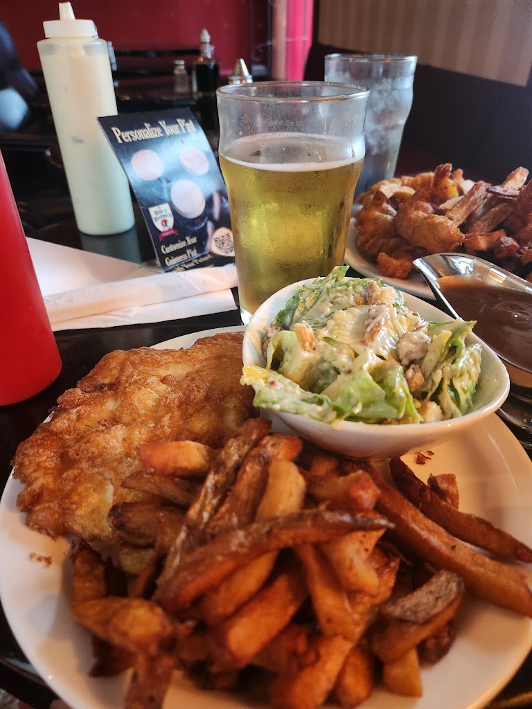 One of the best places for real fish and chips. Had the 2 piece and my wife had the 1 piece with garden salad. The batter was light and crispy. Fries were also good. It was happy hour and the beer on tap was dark horse. Amazing local beer. Will highly recommend this place and will definitely visit again.