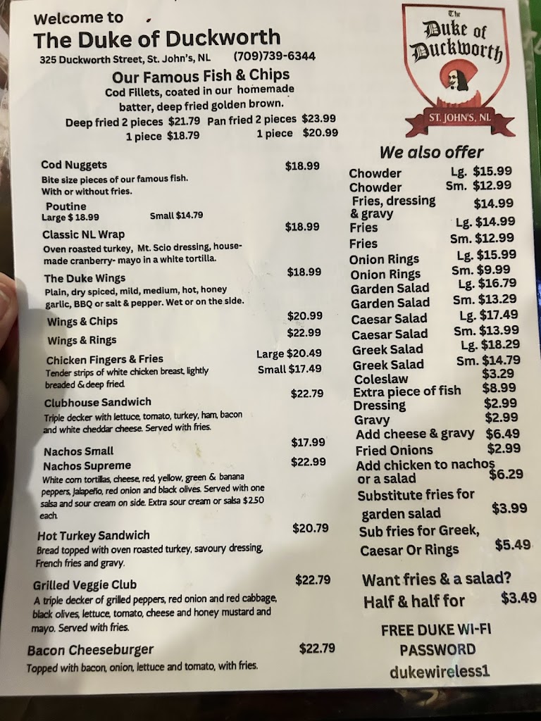 We visited The Duke last week while in St.John s on holiday from NewBrunswick. We read the reviews and wanted to try the food based on the rave reviews and I must say we were not disappointed. We all had the fish n chips and they were absolutely delicious! Servings were huge! Great ambiance and the staff were wonderful. A must see pub to visit.