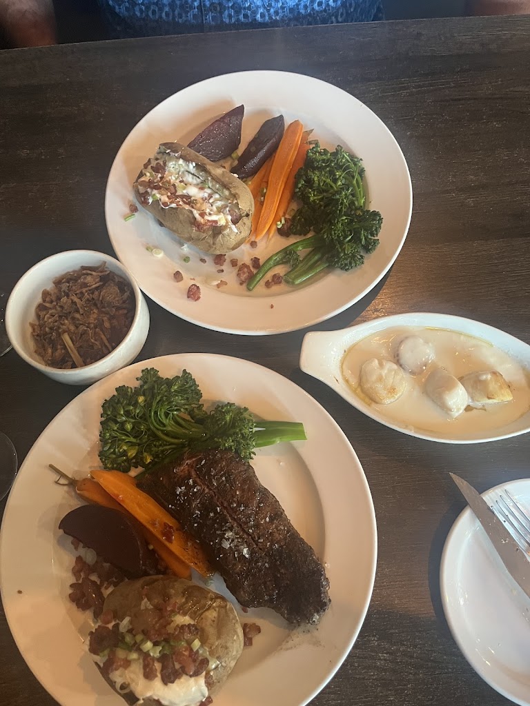 Steak was good, never got our mushrooms and onions until the meal was finished. Baked potato wasnt warm enough to melt the butter and the vegetables were steamed but raw. The muscles were too salty to eat. The drinks were double the price of anywhere in town as well. For a $200 meal, we were not impressed!