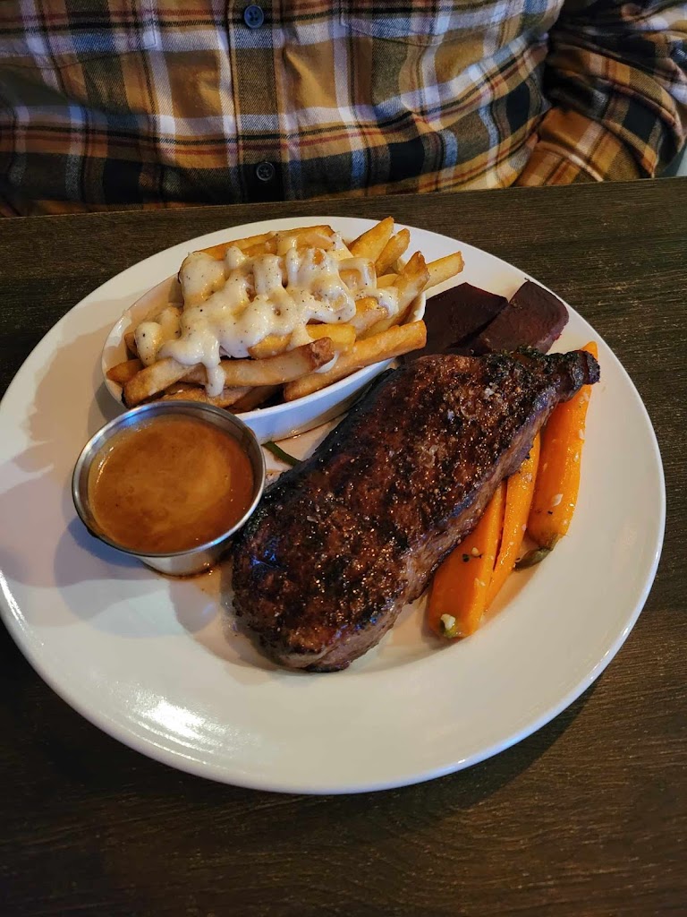My wife decided it s been too long since our last visit, so we went to celebrate her birthday tonight. We both had the Canadian wagyu steaks medium rare, garlic mashed potatoes, carrots, broccoli and onions for our main course. She enjoyed the Apple Cobbler and I had the creme brûlée for dessert. We thoroughly enjoyed our time, our server was excellent with a great sense of humour to boot! The people, the food and the presentation were top shelf, definitely looking forward to the charm! Dietary restrictions: The young lady who took our reservation specifically asked if we required any special food preparation, very conscientious of her guests. Parking: Ample space and on grade for anyone with mobility issues.