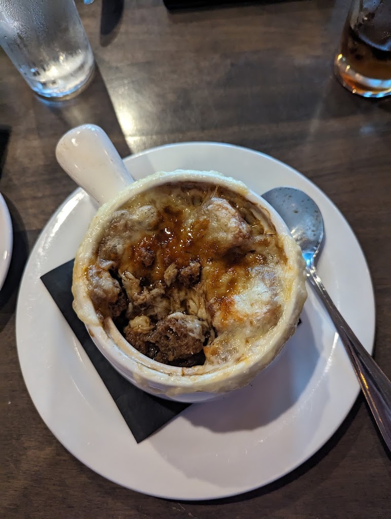 High prices for low-quality food. They had a steak bite appetizer that was overcooked enough to give your jaw a great workout. The striploin steak came out more medium than medium-rare, though it was tasty regardless. Im fairly certain that the French fries, which are approximately $15 a serving, came fresh out of a freezer bag. The French onion soup was just...off. The croutons in it had an odd texture and there was something in the broth that just did not work. That being said, the servers were excellent and the service was quck. The women who served us were friendly, knowledgeable, and attentive. All in all, for over $100 for two people, one would hope for good food AND good service.