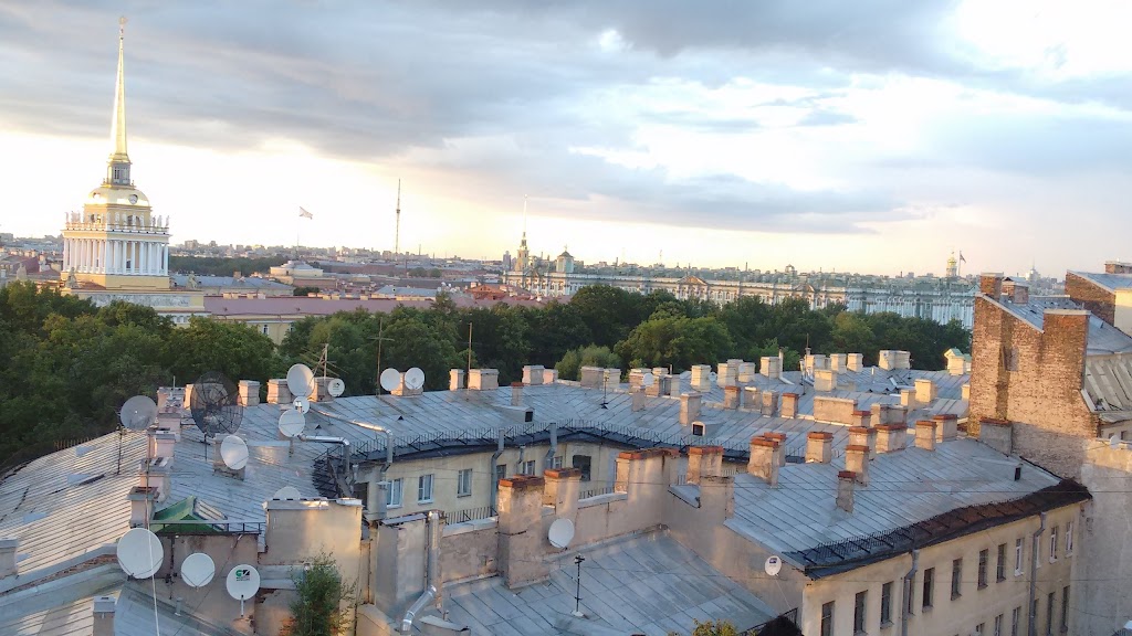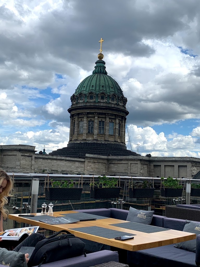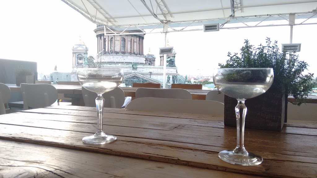 Roof bar with wonderful views of St Isaac's Cathedral and beyond. 900 Roubles for a vodka martini, but an amazing experience. Blankets and heaters for when it gets cold and a DJ after 8 pm (at least when I was there on a Sunday evening).