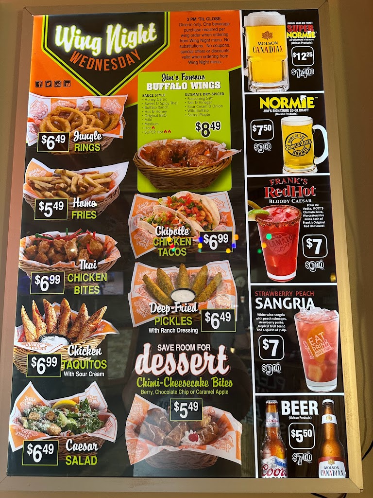 Fun atmosphere, great food and the Thursday night deal was great. Came from out of town and needed a place to eat after 8pm and stumbled across Jungle Jim s. Apps were awesome and the monster grill plate was perfect. Highly recommend the steak and ribs. Wings were only ok, hot wings were sweet for some reason but overall was very happy with the meal and service.