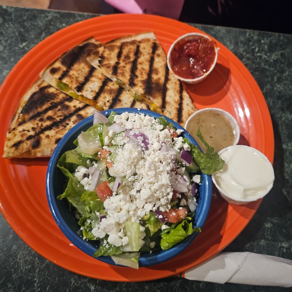 I have been here before and the food was good. My husband and I went there for supper last night and couldnt eat the food, it was terrible! Quesidias tasted burnt, the Ceasars salad had no dressing, and my husband couldnt eat his pasta dish!I have never seen him leave a restaurant without eating his food, we will not be going back. Our meal came to 50 dollars what a waste. We told the server and all she said was sorry and here is your bill!