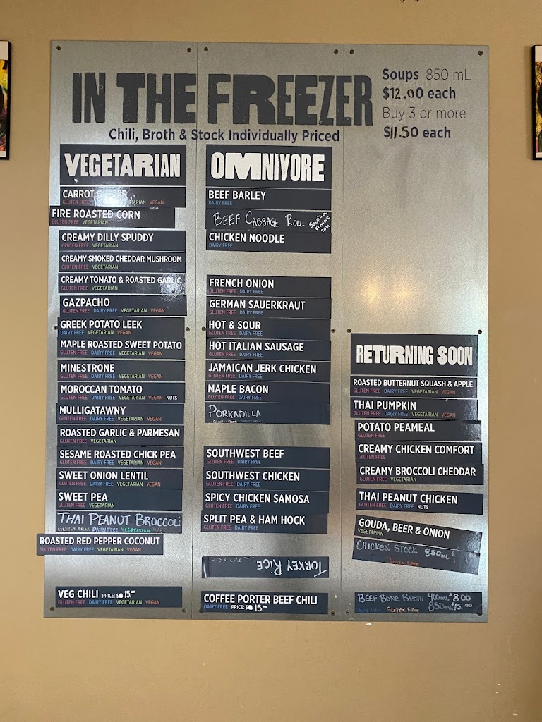 Wonderful place! Great soup. They have several wonderful soups and lots more frozen for take out. The soup is made in house and they have freezers full of it. From soups with meat to vegetarian and even vegan! We stock up nearly each time were in Stratford. They also have a soup card and a score sheet where you can log what soups youve tried. Delicious!