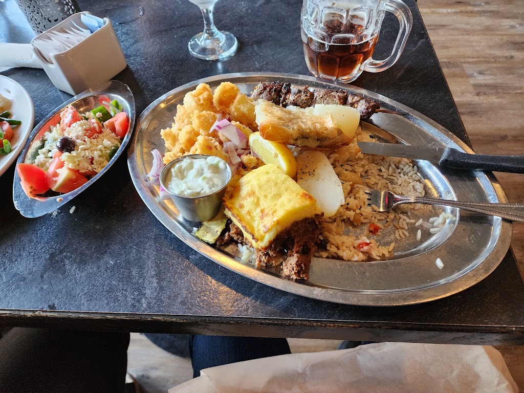 We went to this restaurant for dinner and was disappointed with our meal. I ordered a Greek platter, and the lamb was tough and cooked well done. The salmon was dry, the chicken was overcooked, and the prawn dish had too much oil. There are a few good things here, like our server was very good. Lots of food on our plates. Meal prices are reasonable. So our dinner experience didn't turn out that bad. I still gave the server an 18% tip when we left. Maybe next time we come here, food will be cooked better.