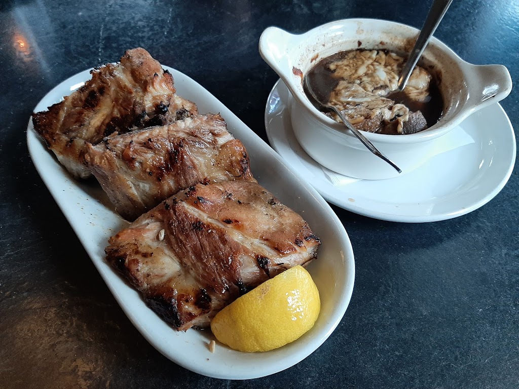 Bowl of soup very small, feels like cup size and over priced. Tastes like campbell soup with deadly amount of salt. Told our server about the it being overly salty, and got a reply roughly: Never heard anyone say that. What a great response. Kota Skaras the thigh & leg are ok, but the breast is very dry, tough, and bland taste. The salad came as the side was good tho, generous amount of feta and veggies tastes fresh. The pita bread was good too.