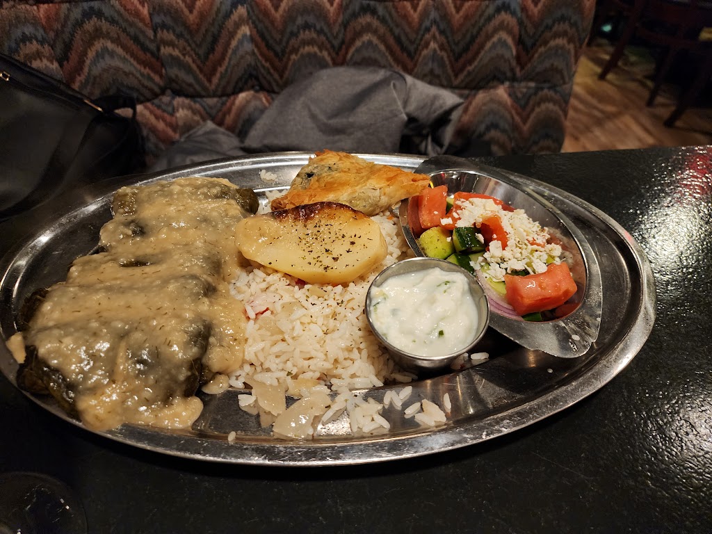 Went for dinner last night. Hadn t been for over 5 years I think or more? Food was excellent. Shared the vegetarian platter with hubby. It was a good value as we took home leftovers. Best dolmades ever with a creamy lemon dill sauce. Great for families or couples. They have nice cozy booths. The bathrooms are updated. I am looking forward to eating here again or take out. Vegetarian options: Dolmades spanakopita and potatoes and rice and bread Dietary restrictions: They will do their best to accommodate. Not sure if any gluten free or vegan options but a few good vegetarian options. Would be great if they had more. Like a veggie only moussaka or vegan dessert. Parking: Ample parking around the back. Few spots in front. Kid-friendliness: High chairs available (I think) Wheelchair accessibility: Yes except for second level.