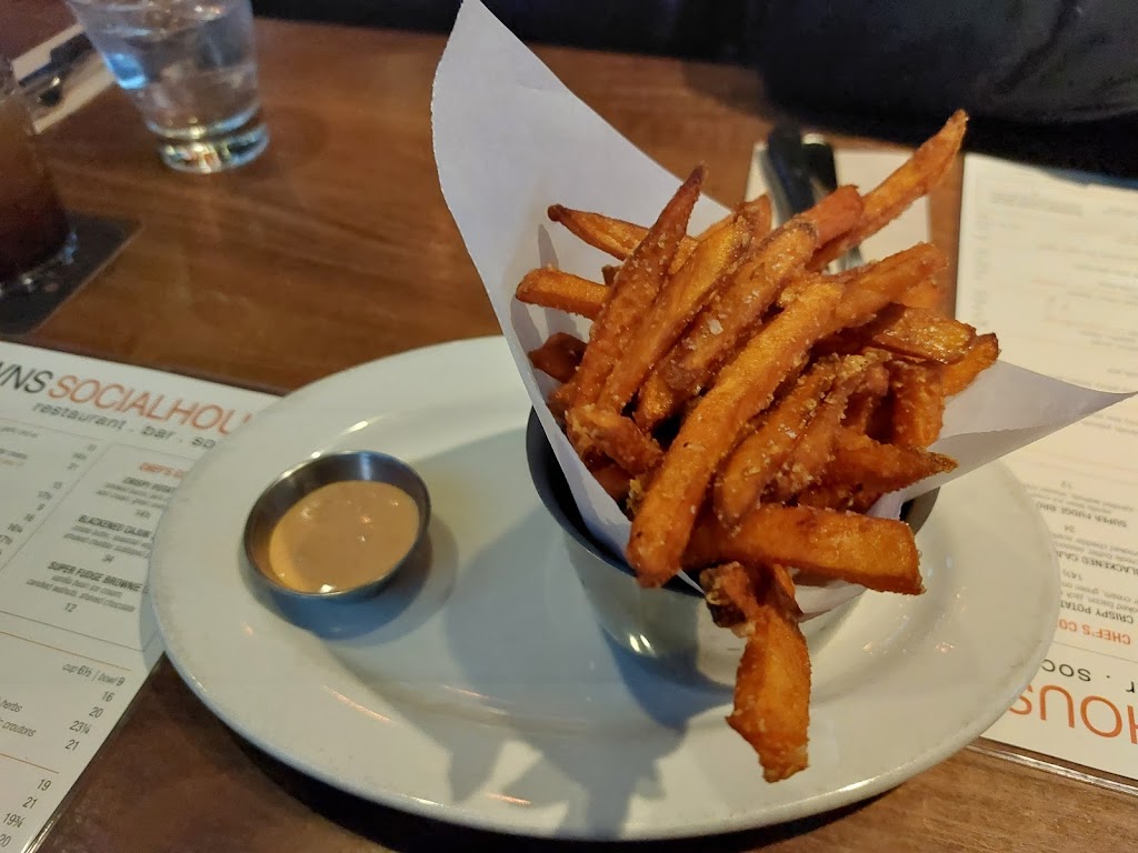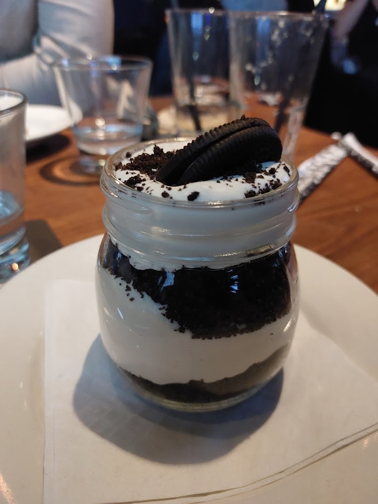 After a spontaneous appointment left us hungry and seeking food yesterday afternoon, we thought wed take the opportunity to turn this outing into a date night. So Ozzy (hubs) quickly scanned his phone for local restaurants that ticked off all the boxes mainly, good food at affordable prices, comfortable atmosphere, and not too far from home and stumbled upon Browns Social House. Neither one of us had tried it out before, so we thought wed give it a go. And boy, are we glad we did. We both ordered steak dinners, which is kind of gutsy considering the sports bar-like atmosphere. Ozzy had the Steak Frites (aka fries, which are to die for!) while I went for the Blackened Cajun Sirloin, graced with smoked cheddar scalloped potatoes and seasonal veggies (broccoli). Ozzy thought the scalloped potatoes sounded so good, he ordered a side for himself. And here I thought *I* was the potatoholic. We both ordered the roasted mushrooms as an extra which is a definite do-again. And due to the confidence in Todds eyes when he assured Ozzy the chef knows how to cook a steak, Ozzy went for broke and ordered his blue rare. He did not regret it. I went for medium-rare and it was utter perfection. *mwah* Ozzy upped his game with an enticing 9 oz glass of Canadas own Jackson-Triggs red wine, which just happened to be their house wine. One of my faves. However, next time and there WILL be a next time I might just take him up on that glass of pineapple jalapeño marg(arita). I often kid around to friends and anyone wholl listen that Im addicted to jalapeños and will eat them in just about anything. I didnt think Id be considering drinking them, but here we are. For dessert, we tried their housemade Oreo Cookie Jar. Slightly full from dinner, we thought wed order one and share it. So romantic, right? Sure thing, but next time Im having one all to myself. This amazing dish was cheesecake layered with crushed oreo cookie. There was some whipped cream and an intact oreo involved, but thats all I can remember before drifting off into an oreo-cheesecake stupor. As for service, I hope Todd is the standard there, because it was refreshing to have someone of his caliber helping us make our first-visit choices. He was laid back, friendly, knowledgeable, and attentive without being intrusive. The last time I ate at a steakhouse, I confused the poor young server with the same questions I put to Todd. The dinner rush was starting to kick in as we headed for the door. But before leaving, I took the opportunity to look around a little more. They have a casual bar that reminded me of Cheers in a way, with a few patrons sitting around. Theres a large gap in the wall, offering patrons a peak into the kitchen. In addition to indoor dining, they also have a nice-sized seasonal patio with trees and stuff. I look forward to trying it out next summer. Ive also just discovered they do pickup and delivery. Looking forward to trying this out in the very near future. I wonder if they deliver the oreo-cheesecake?