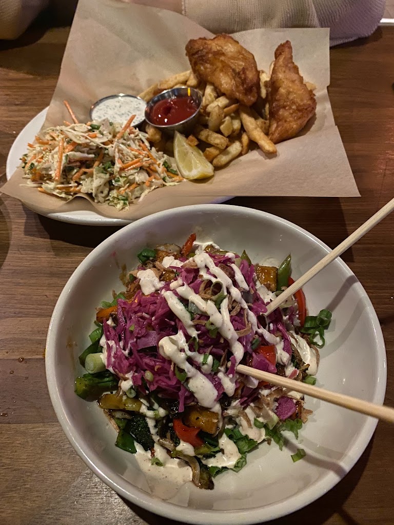 We always get takeout from here. My fave dish is the potato crusted cod bowl served with salad and delicious rice. I have a celiac so it s the perfect meal without the croutons of course. I ve informed them each time about my concerns and they even write gluten free on the bowl when I take it home. The food is always cooked perfectly and taste great. Dietary restrictions: I have celiac disease and every time I ve eaten here I have had wonderful experiences. They take it seriously.