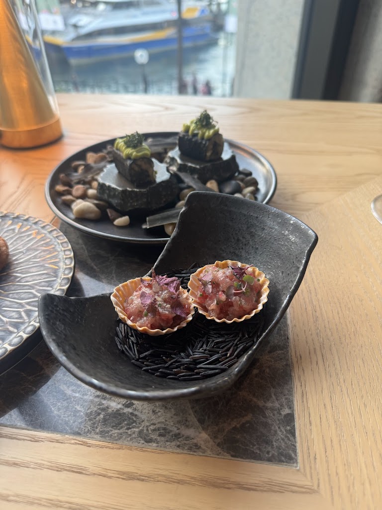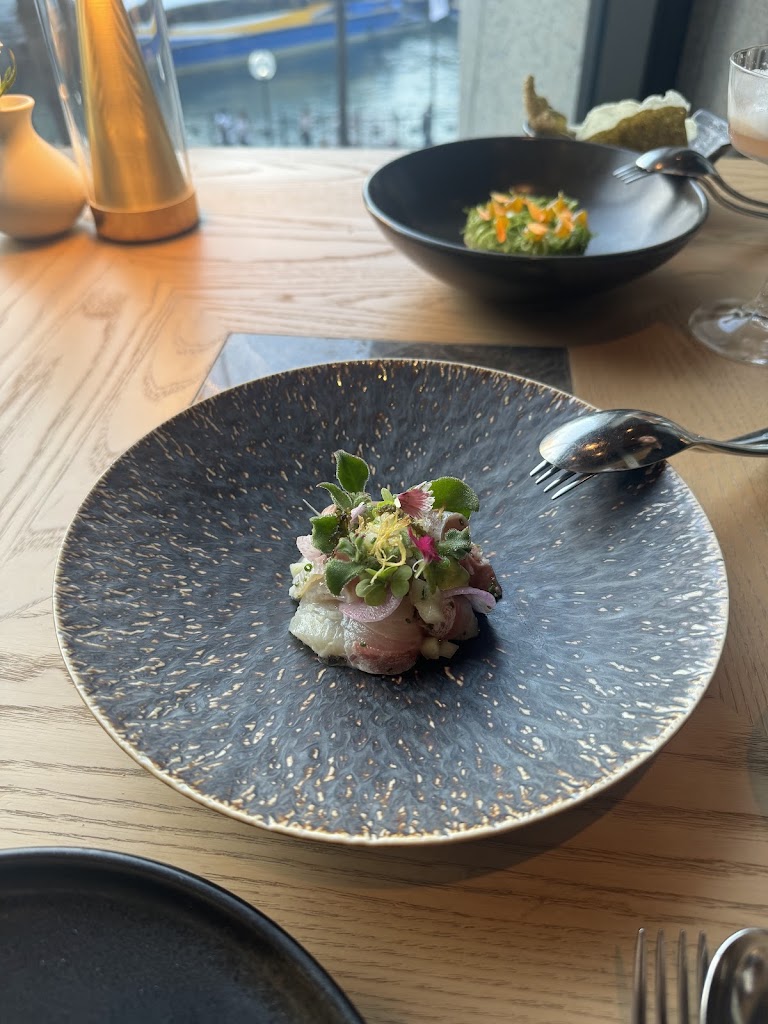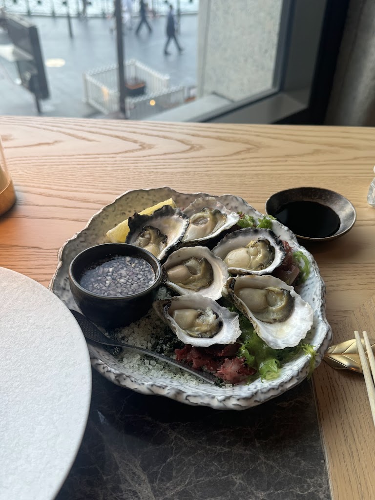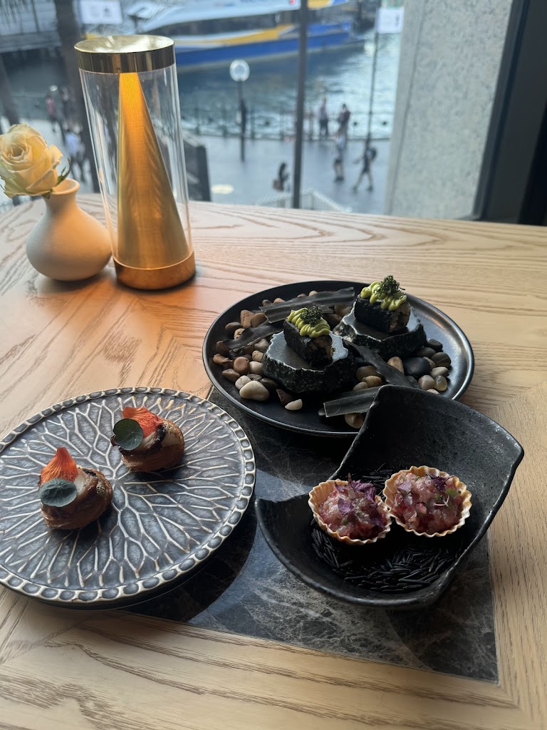Came here on a great sunny afternoon and was kindly greeted by staff! They asked if there was any special occasion for us which we didn’t have but i assume they do special writing and touches if it is! The window seat was so nice, and a great spot to just look over the water and people. I like how they have the seating angled so that both people can see. The decor was so pretty and sleek. We got the three course set and found that we were quite full! Of course with some small additions of oysters, sashimi and potato sides. The dishes were spaced out quite nicely and in between dishes they would clean our plates and the table which was a very nice luxury experience! The oysters were nice and the mignonette was very nice. The sashimi was played very nice and was just okay in my opinion. Maybe a skip from me! The snacks were really great, the sushi roll was my least favourite, the flavour was just soso. The toro tart was really good and it was light and it had a good combination of the crunch texture and the soft sashimi. The warm octopus cruller was really nice and it was warm, I liked the white strawberry too. The bread was nice and and the miso butter was so good, I wish there was more butter!!! We got the kingfish which was nice with the cream but there were small pieces of jelly that were bursting with flavour! The beef tartare nice, with the nori chips, i feel like it was just okay. I would maybe recommend trying another dish instead! The toothfish was so good, it wasn’t too caramelised or sweet which I find some other places do. I liked the sauce with it as well. The fish was cooked well. The stockyard chuck tail flap was really good too, just on its own, the additional things on the plate were okay though. The steak was so flavourful and buttery! The potatoes were nice, quite crispy !!! The pre dessert was a great fresh palate cleanser. As for desserts, the forest berry saka was not that great in my opinion, it was nice but there was a strange flavour in between I can’t really describe. I much preferred the yuzu mille feuille was was the perfect balance of fresh and creamy!!! The petit fours were nice, the fudge was my favourite!! I like the mandarin spritz as a drink! Overall a great place with great food, love the service and vibes. Perfect for a special occasion!