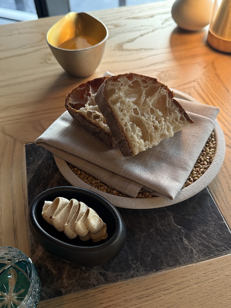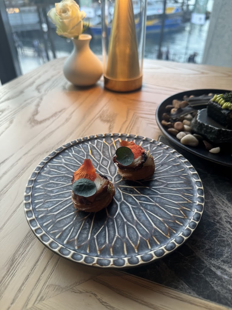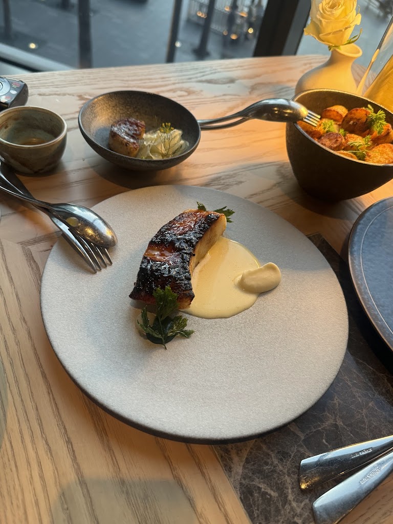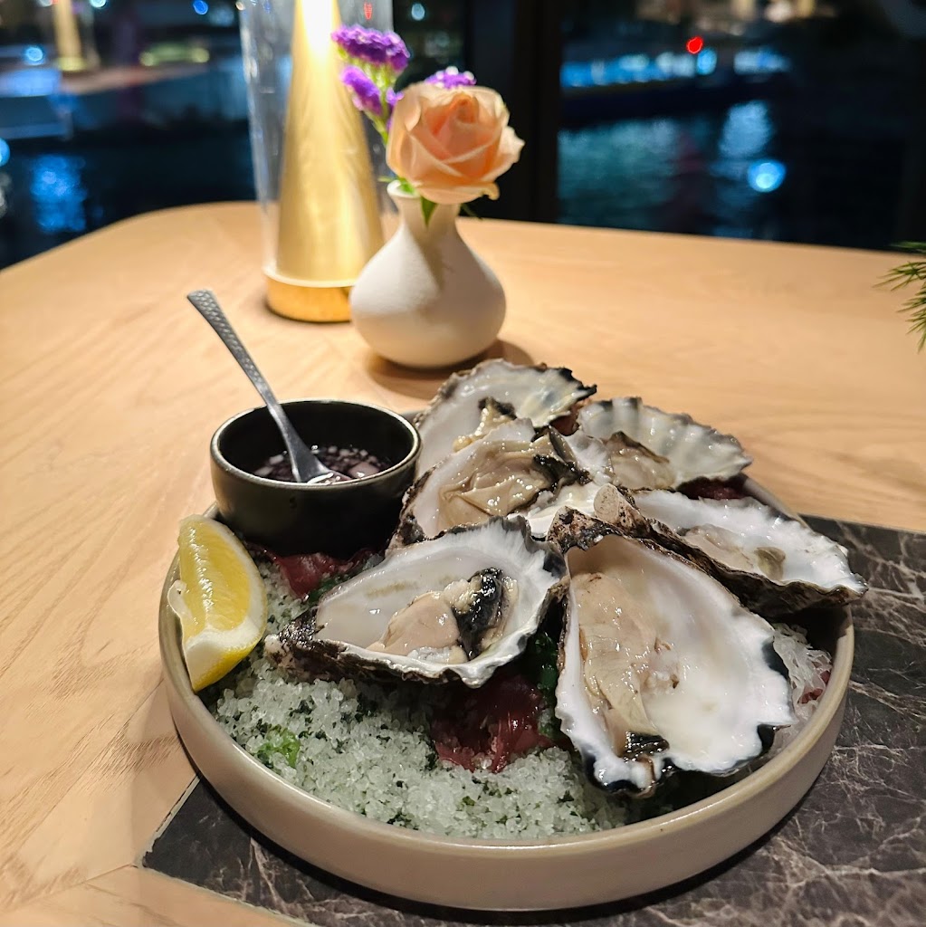 Came here on a great sunny afternoon and was kindly greeted by staff! They asked if there was any special occasion for us which we didn’t have but i assume they do special writing and touches if it is! The window seat was so nice, and a great spot to just look over the water and people. I like how they have the seating angled so that both people can see. The decor was so pretty and sleek. We got the three course set and found that we were quite full! Of course with some small additions of oysters, sashimi and potato sides. The dishes were spaced out quite nicely and in between dishes they would clean our plates and the table which was a very nice luxury experience! The oysters were nice and the mignonette was very nice. The sashimi was played very nice and was just okay in my opinion. Maybe a skip from me! The snacks were really great, the sushi roll was my least favourite, the flavour was just soso. The toro tart was really good and it was light and it had a good combination of the crunch texture and the soft sashimi. The warm octopus cruller was really nice and it was warm, I liked the white strawberry too. The bread was nice and and the miso butter was so good, I wish there was more butter!!! We got the kingfish which was nice with the cream but there were small pieces of jelly that were bursting with flavour! The beef tartare nice, with the nori chips, i feel like it was just okay. I would maybe recommend trying another dish instead! The toothfish was so good, it wasn’t too caramelised or sweet which I find some other places do. I liked the sauce with it as well. The fish was cooked well. The stockyard chuck tail flap was really good too, just on its own, the additional things on the plate were okay though. The steak was so flavourful and buttery! The potatoes were nice, quite crispy !!! The pre dessert was a great fresh palate cleanser. As for desserts, the forest berry saka was not that great in my opinion, it was nice but there was a strange flavour in between I can’t really describe. I much preferred the yuzu mille feuille was was the perfect balance of fresh and creamy!!! The petit fours were nice, the fudge was my favourite!! I like the mandarin spritz as a drink! Overall a great place with great food, love the service and vibes. Perfect for a special occasion!