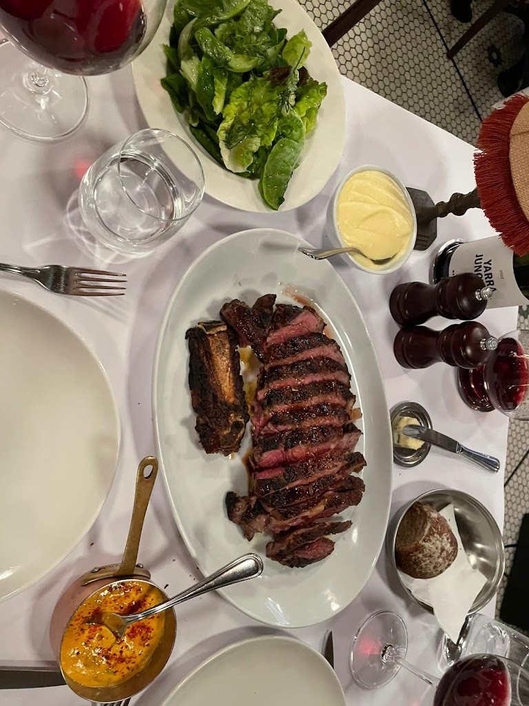 The steak was huge and very well cooked. Food prices are reasonable giving the location and atmosphere, beautifully designed restaurant. Wine is a bit expensive tho ($33/glass). Fit for a fun and fancy but not too serious and formal date, as the restaurant is pretty laid back and noisy.
