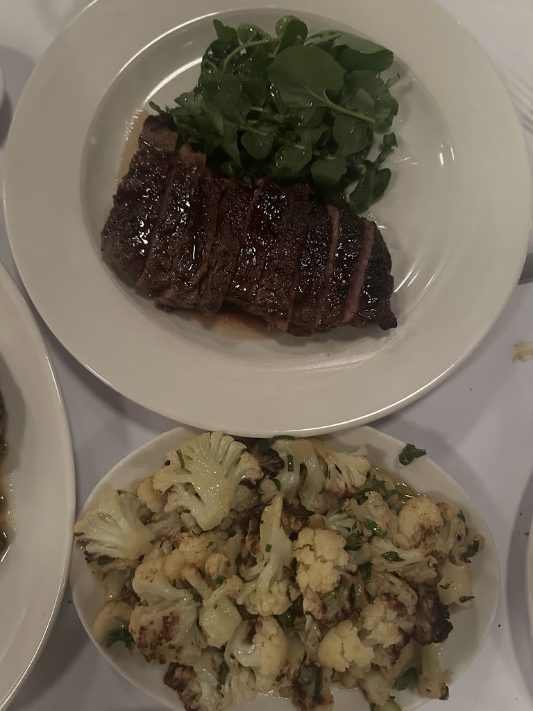 Beetroot salad entree very little taste. Main of 1 kg rib eye on bone was cooked perfectly. Side of cauliflower in butter was too generous in the butter and wasn t popular . A delicious dessert for two of Tarte Tartin would be perfect for 4. Service was at a very average cafe quality, no follow up on how the meals were etc.