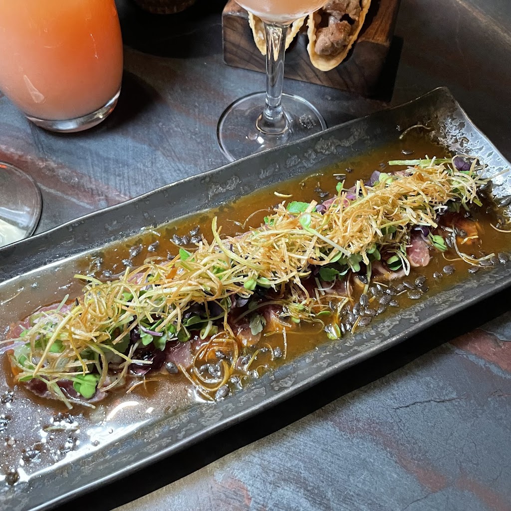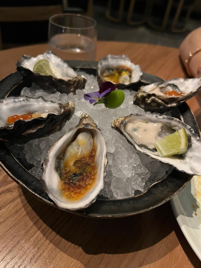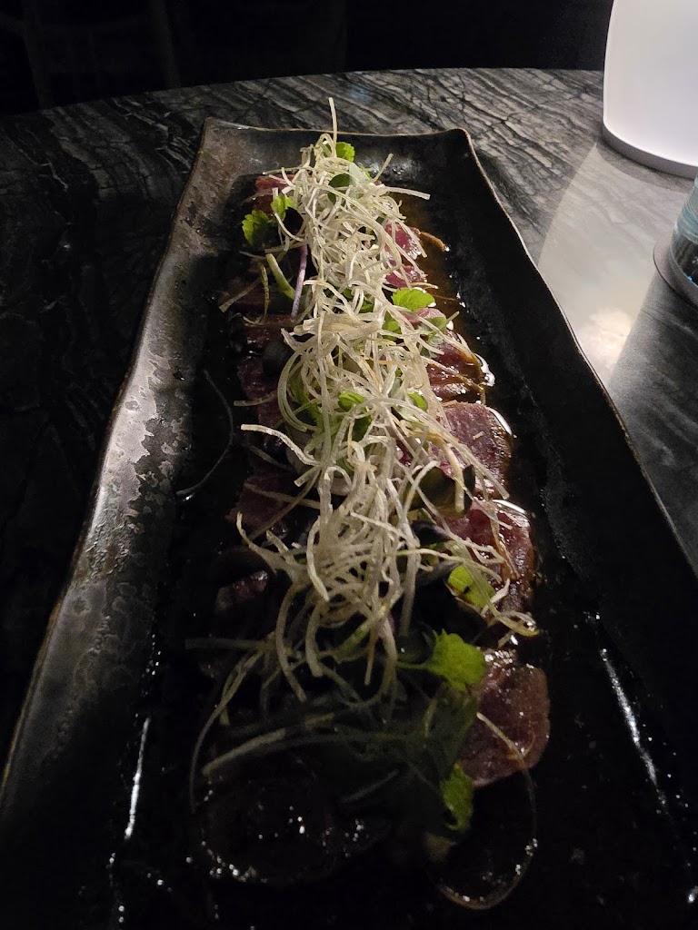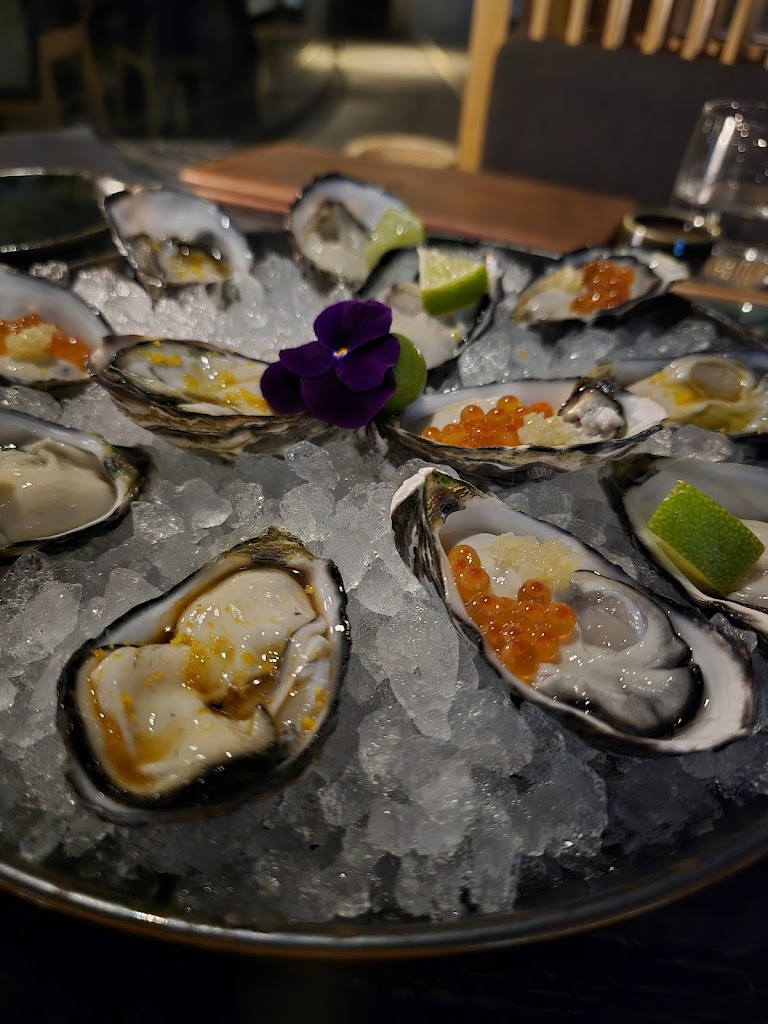 Atmosphere very nice for a romantic dinner. The Kyoto Protocol cocktail was delicious! Oysters was a major disappointment. The sauces was bland. Perhaps they need to work on that. Tiradito Kingfish is a must order. The sauce was a bit too sour but overall it was nice. Salmon belly nigiri was delicious! I wanted more!! Must order! Wagyu tacos is a must order! The wagyu was very tender n sauce a perfect combo with the crunchy taco. The salmon taco I’d skip though; the sauce was not nice at all. The bug tempura was very nice. The batter wasn’t thick n the bug was melt in your mouth. Dipping sauce a tad too sour n the spicy salt on the side was the perfect combo with the dipping sauce. The best dish had to be the Beef Tenderloin, French Foie Gras, honey onion soy. A must order! Dessert of the yuzu pavlova was a disappointment. They didn’t hv much options available tonite so we had to order that. Service was excellent! The girl was very friendly n recommended me a delicious cocktail so I’m happy! They wrote happy anniversary on our dessert plate which is very nice of them!